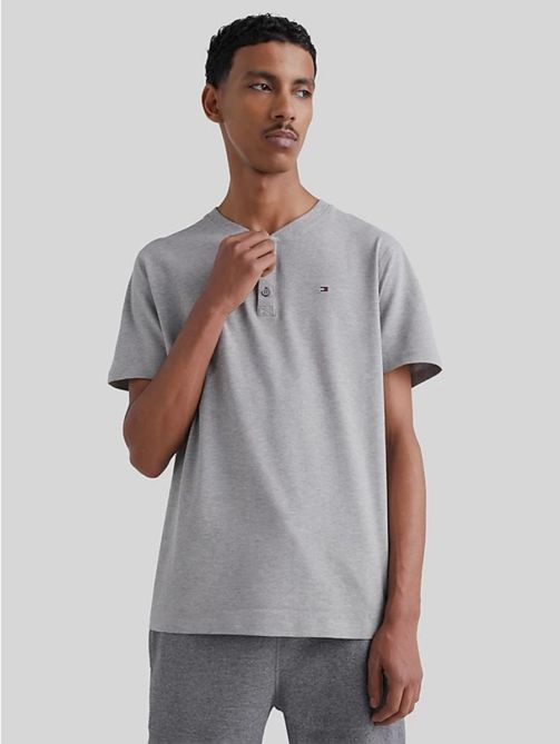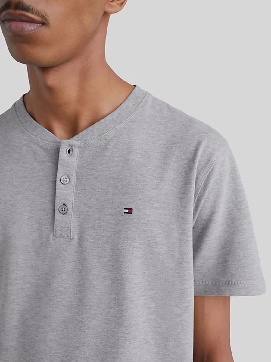 احصل على إطلالة فريدة مع تيشيرت بأكمام قصيرة مصنوع من القطن العضوي المرن ويتميز بياقة هينلي لإطلالة كلاسيكية.