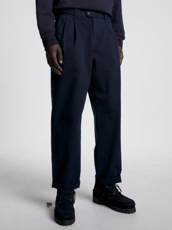 ارتدي بنطلون تشينو بساق واسعة مصنوع من مزيج القطن العضوي المطاطي المعاد تدويره للمزيد من الراحة والأناقة.