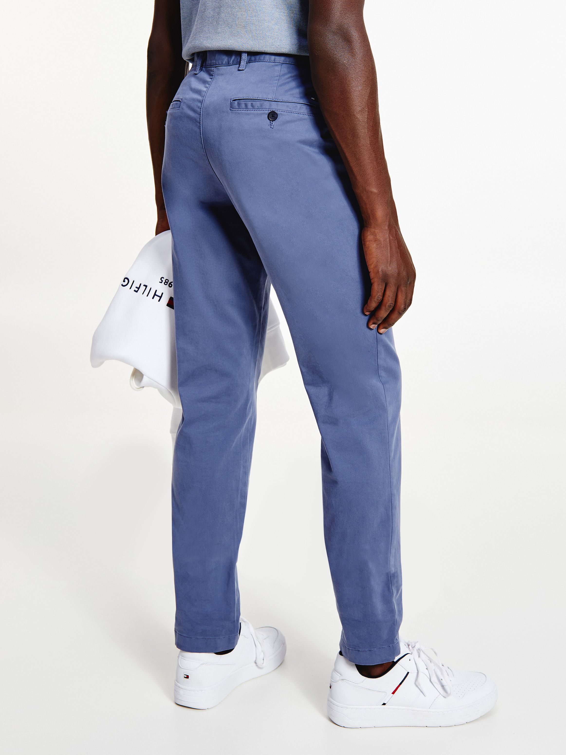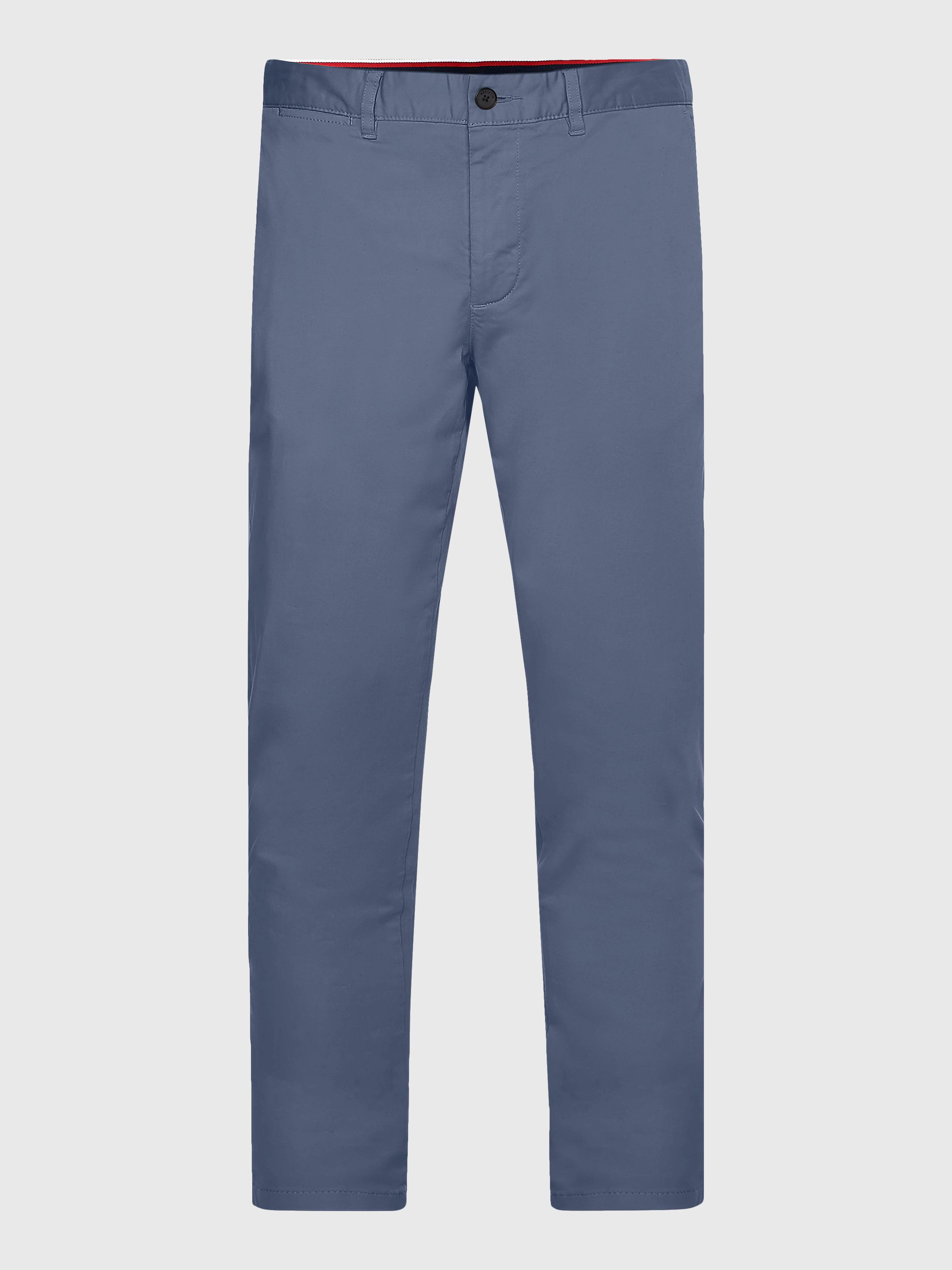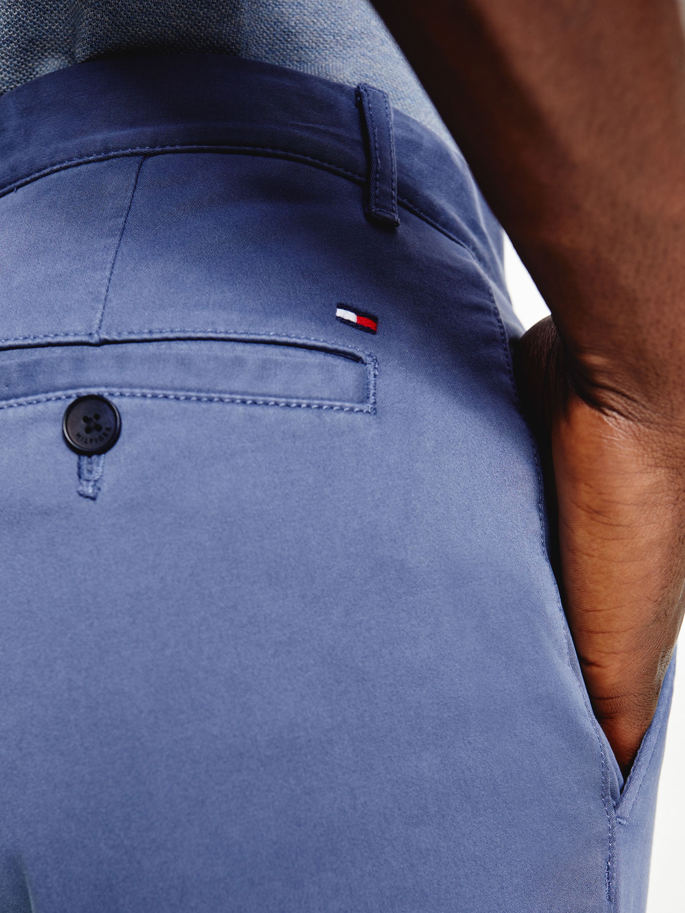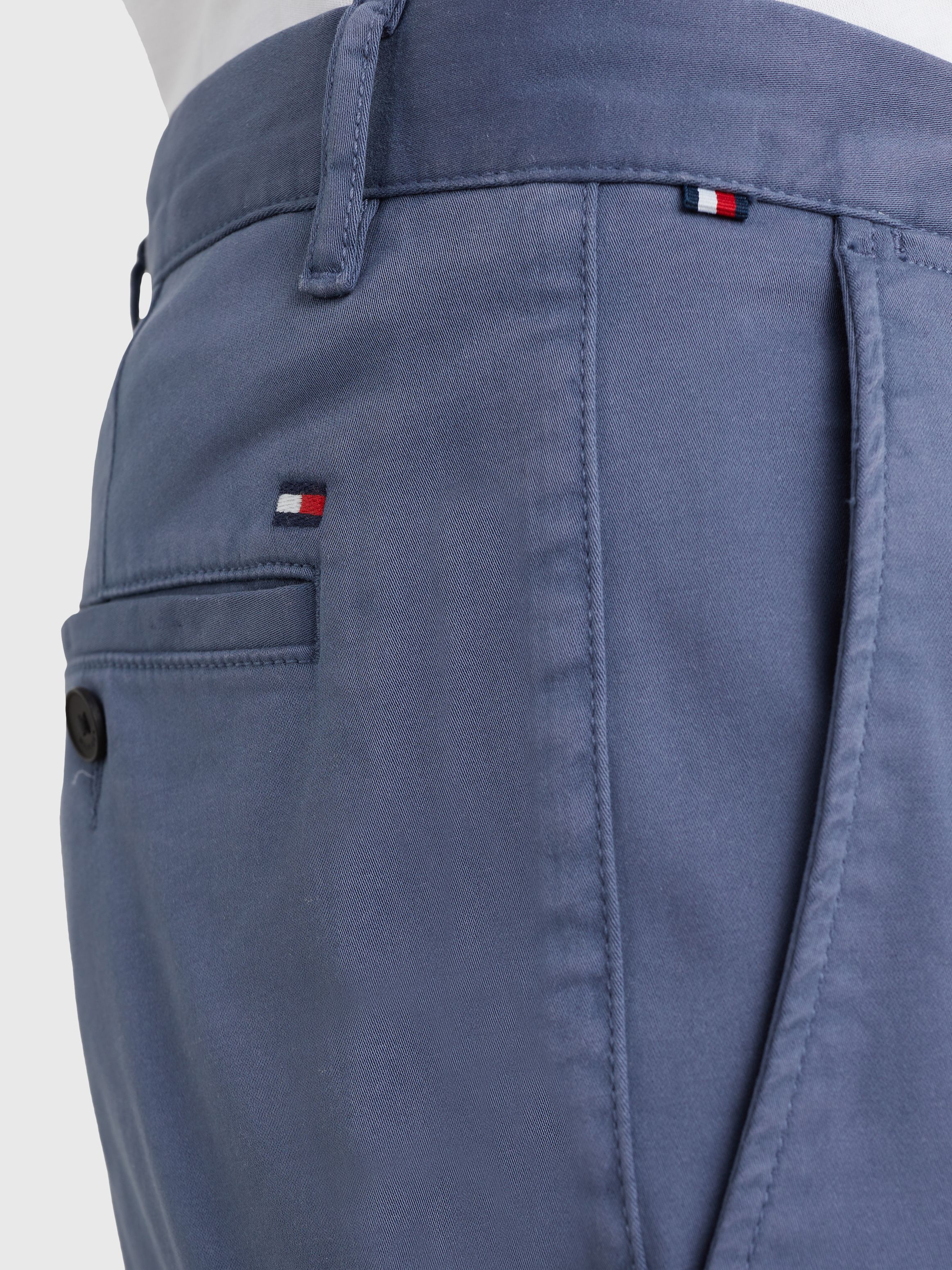 • قطن ساتان مطاطي • تقنية فليكس • نسيج مصبوغ • يُغلق بسحاب مع زر • حلقات على الحزام • جيبان جانبيان مفتوحان • جيبان خلفيان بأزرار • علامة تومي هيلفيغر التجارية
