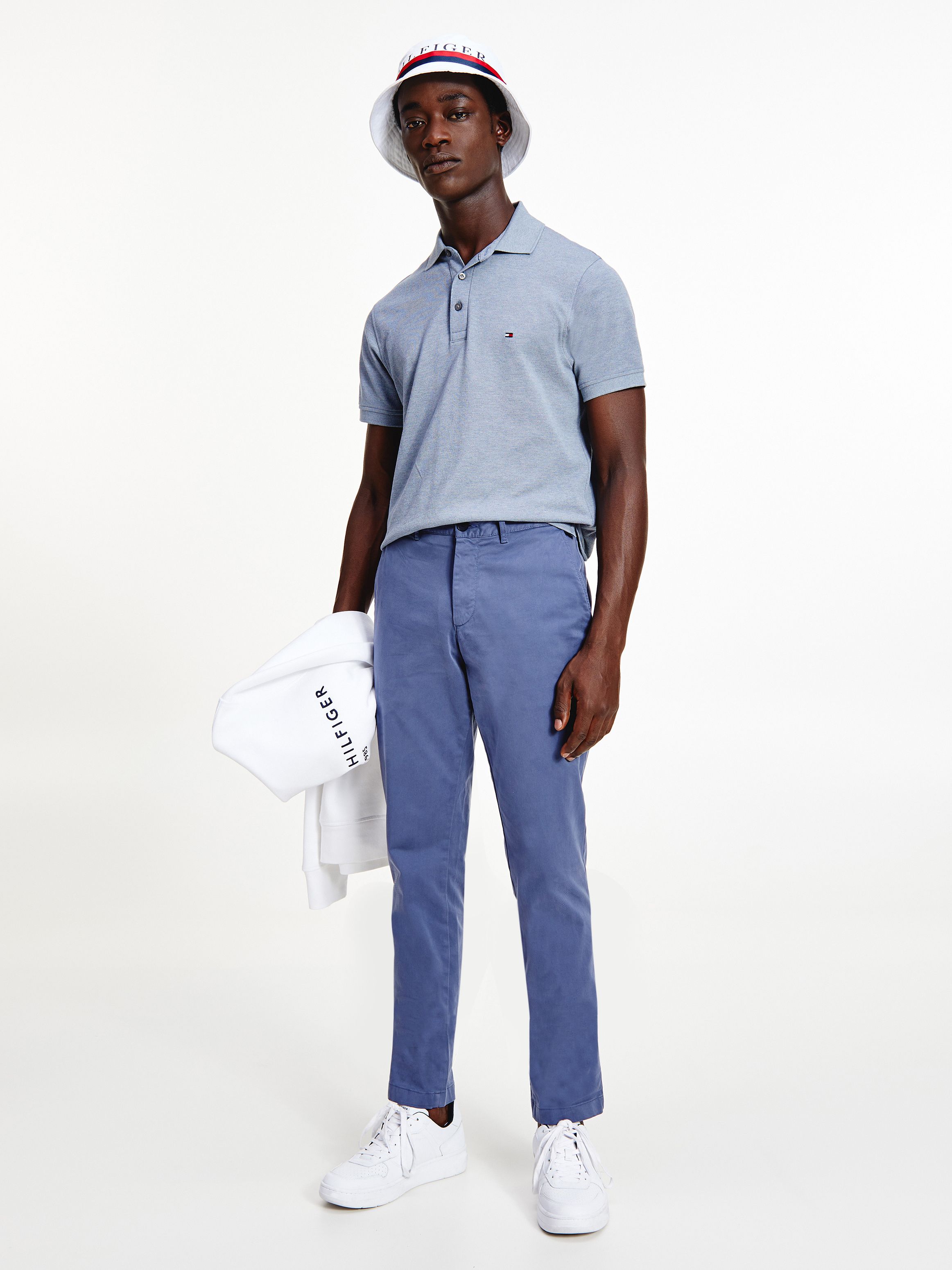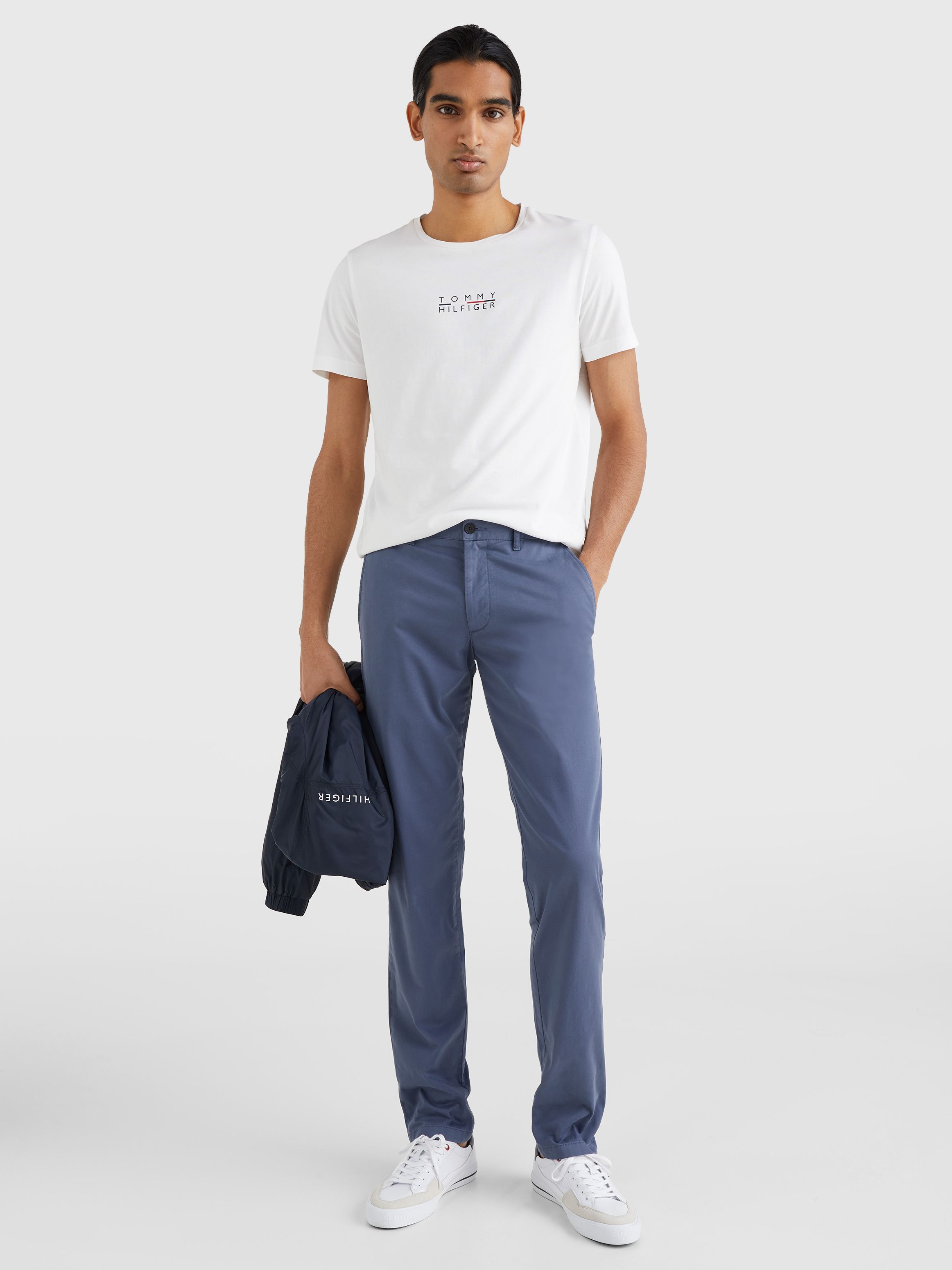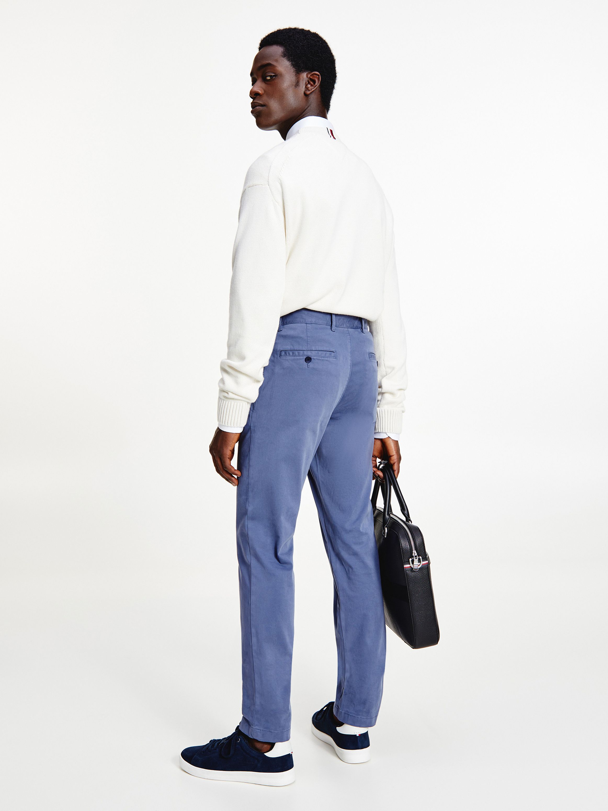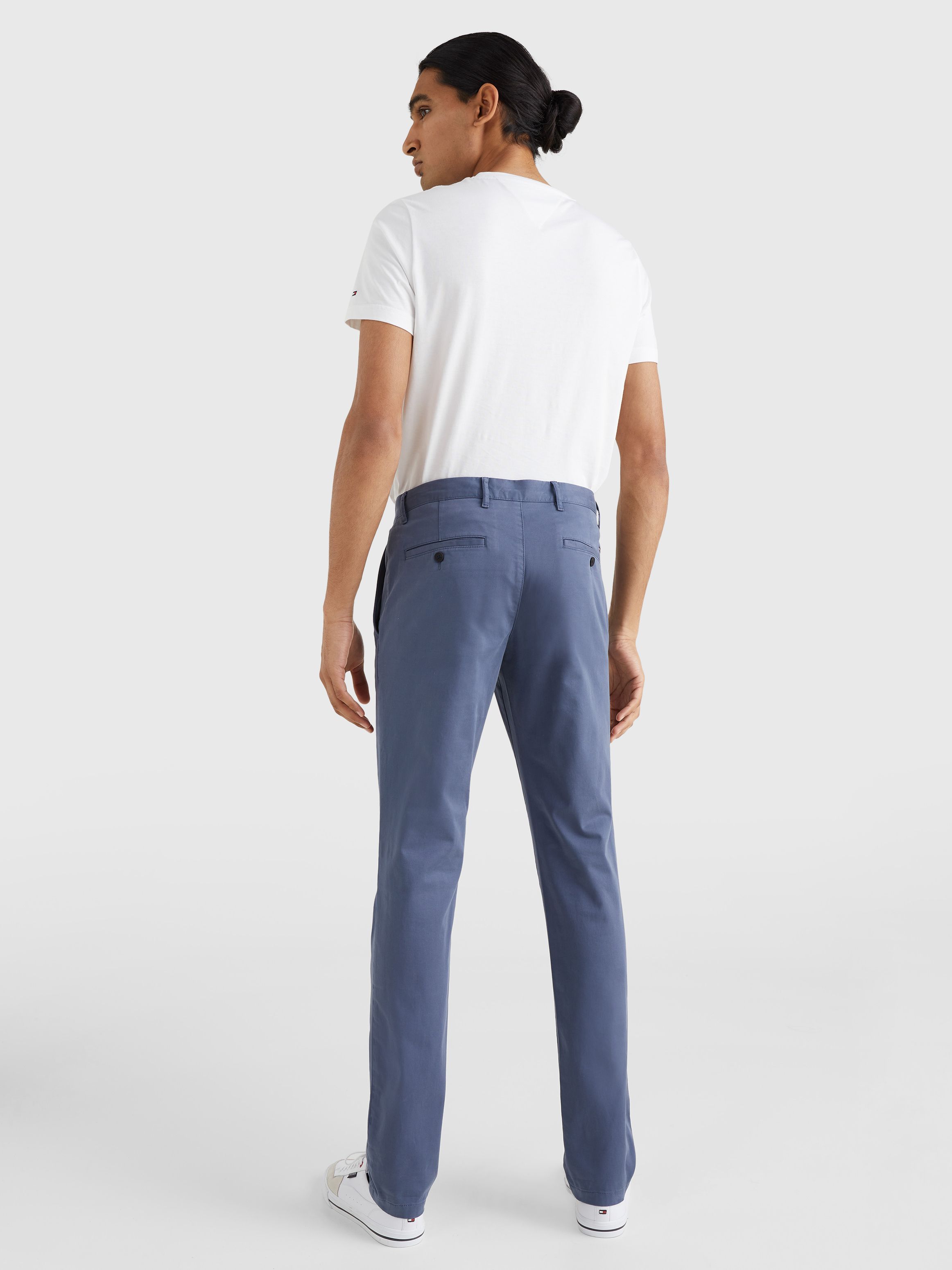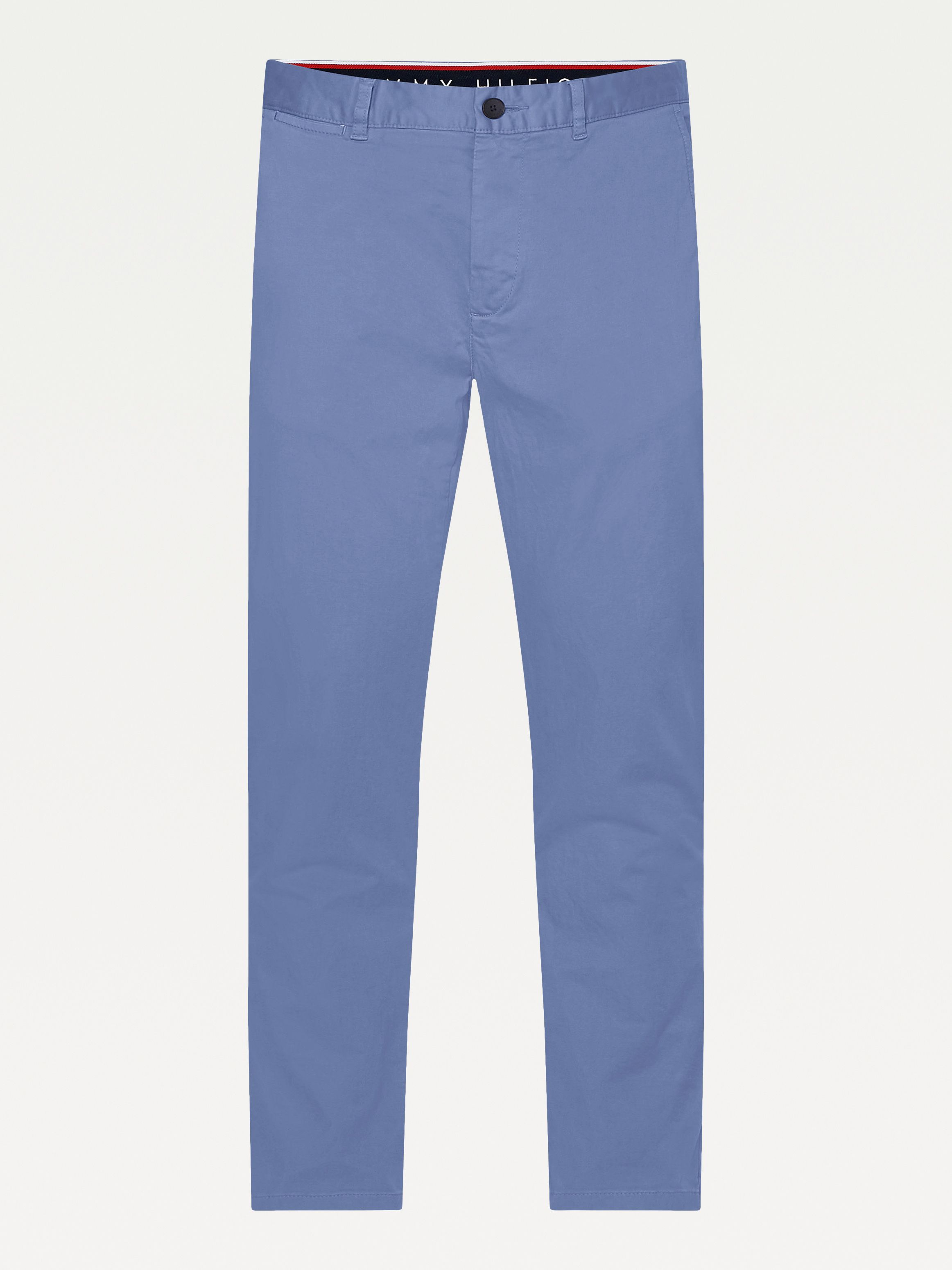 • قطن ساتان مطاطي • تقنية فليكس • نسيج مصبوغ • يُغلق بسحاب مع زر • حلقات على الحزام • جيبان جانبيان مفتوحان • جيبان خلفيان بأزرار • علامة تومي هيلفيغر التجارية