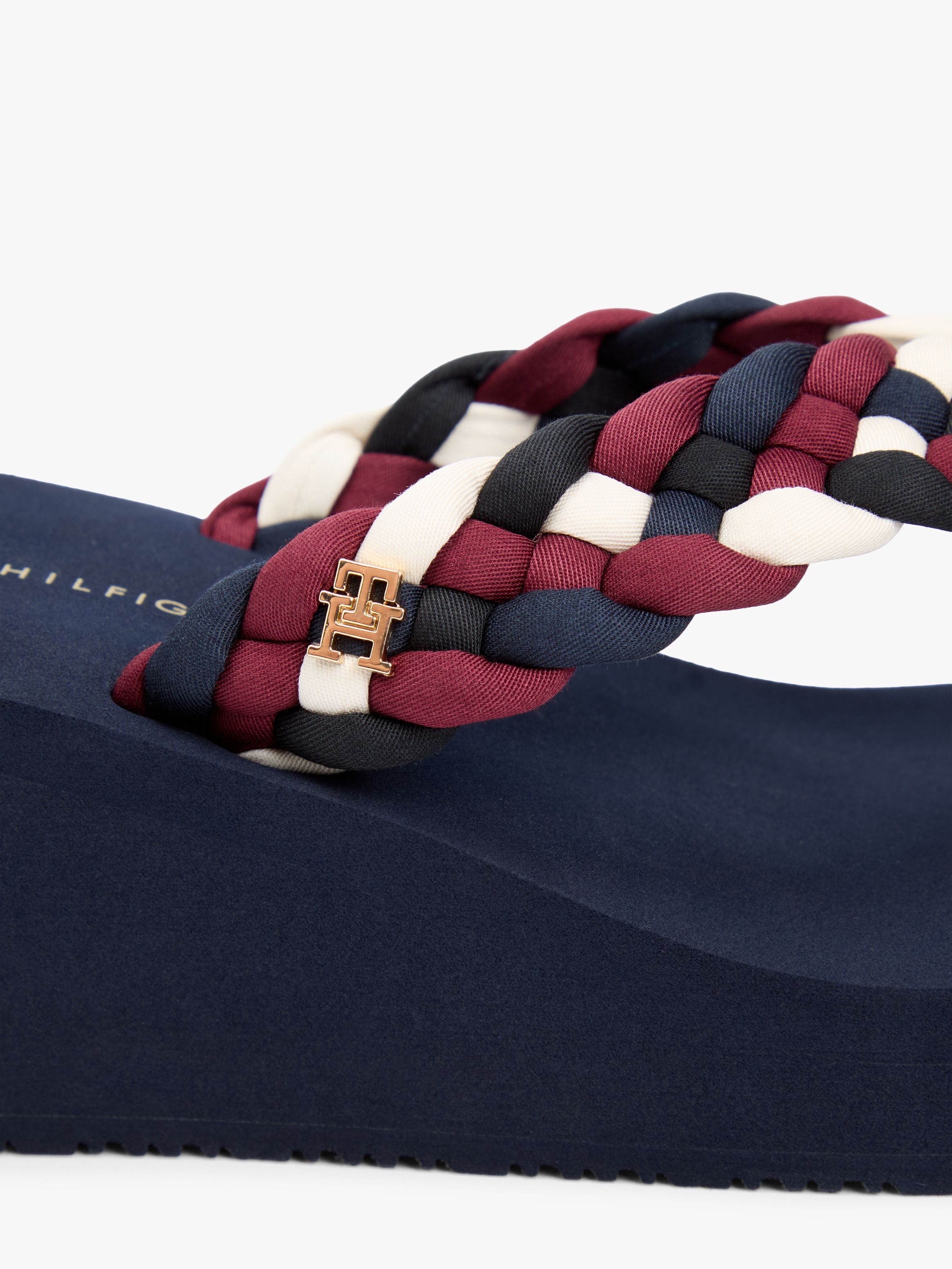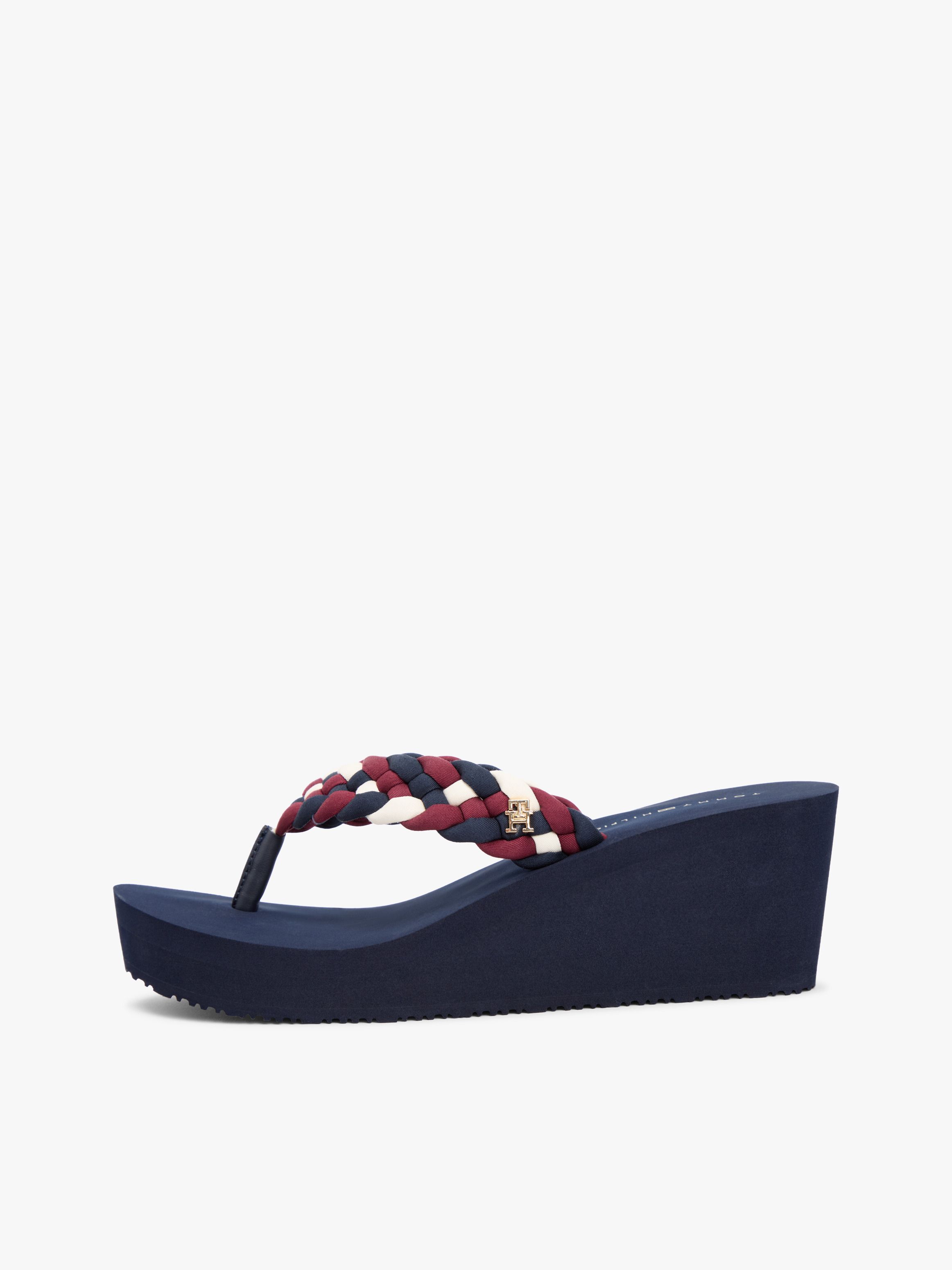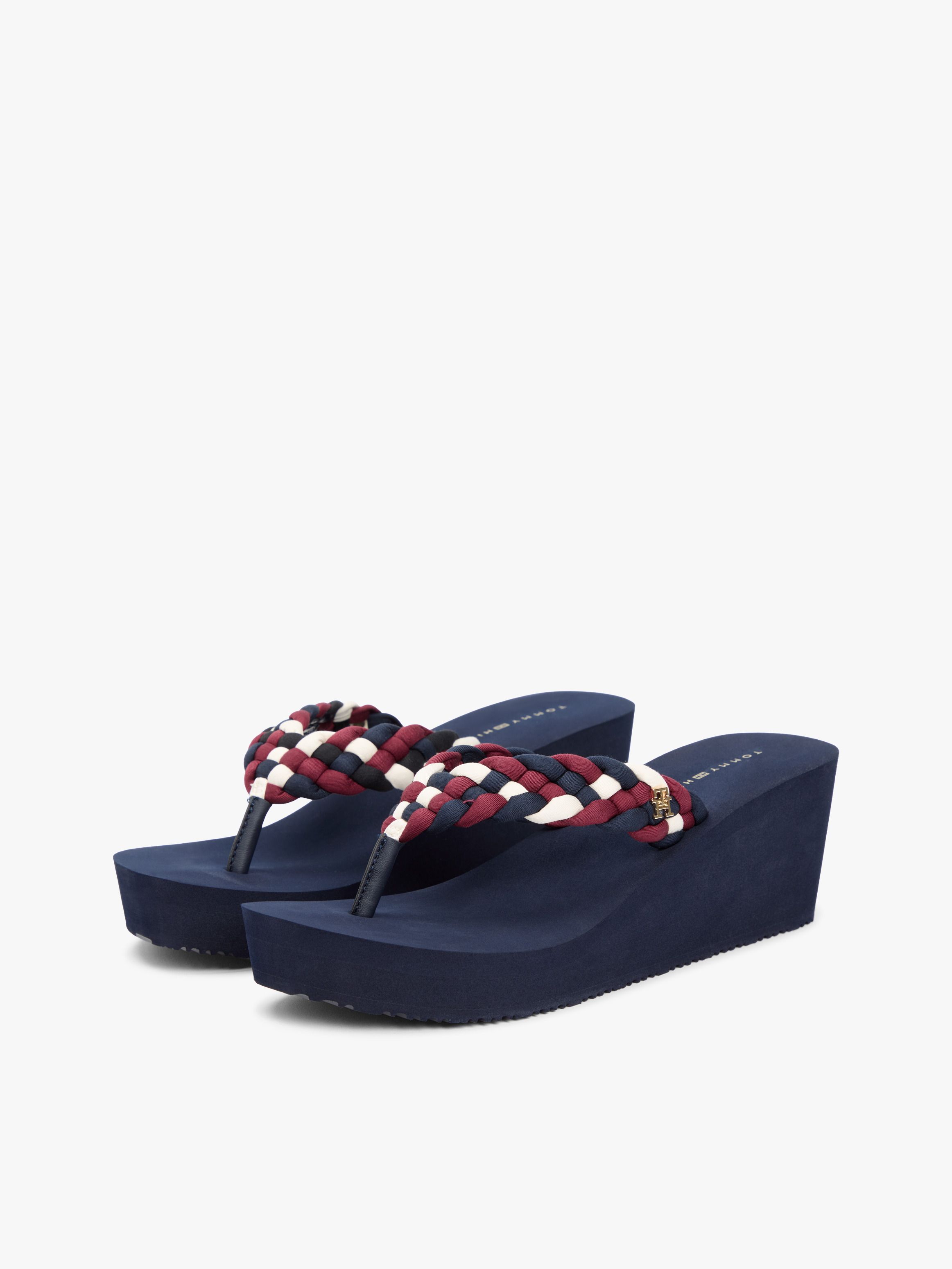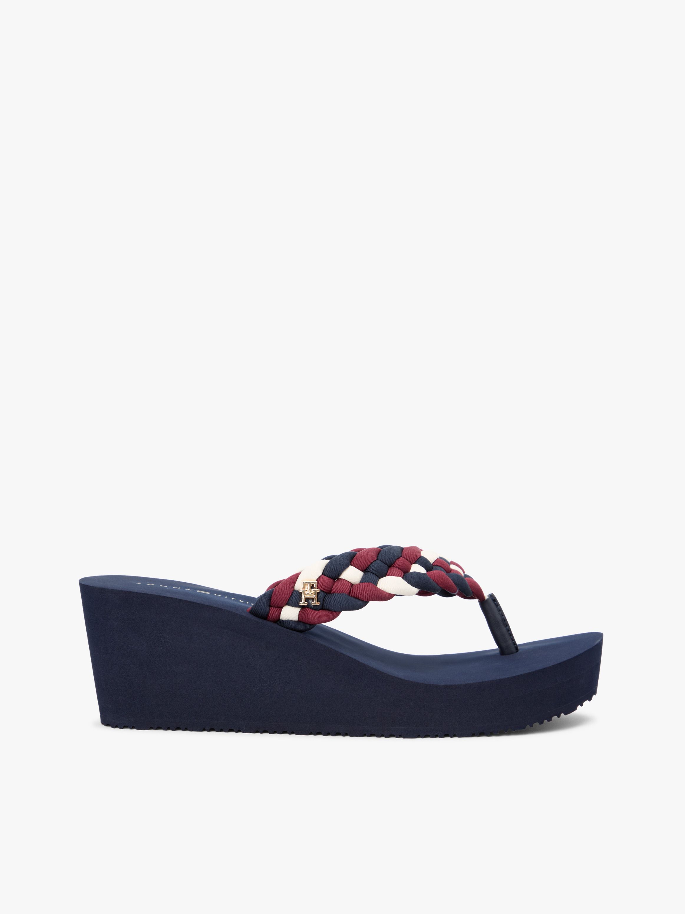 تدعو أجواء الصيف إلى هذا الشبشب الفاخر، الذي يجمع بين تصميم بكعب ويدج مرتفع وأحزمة مجدولة سميكة مع لوحة حروف TH لامعة.