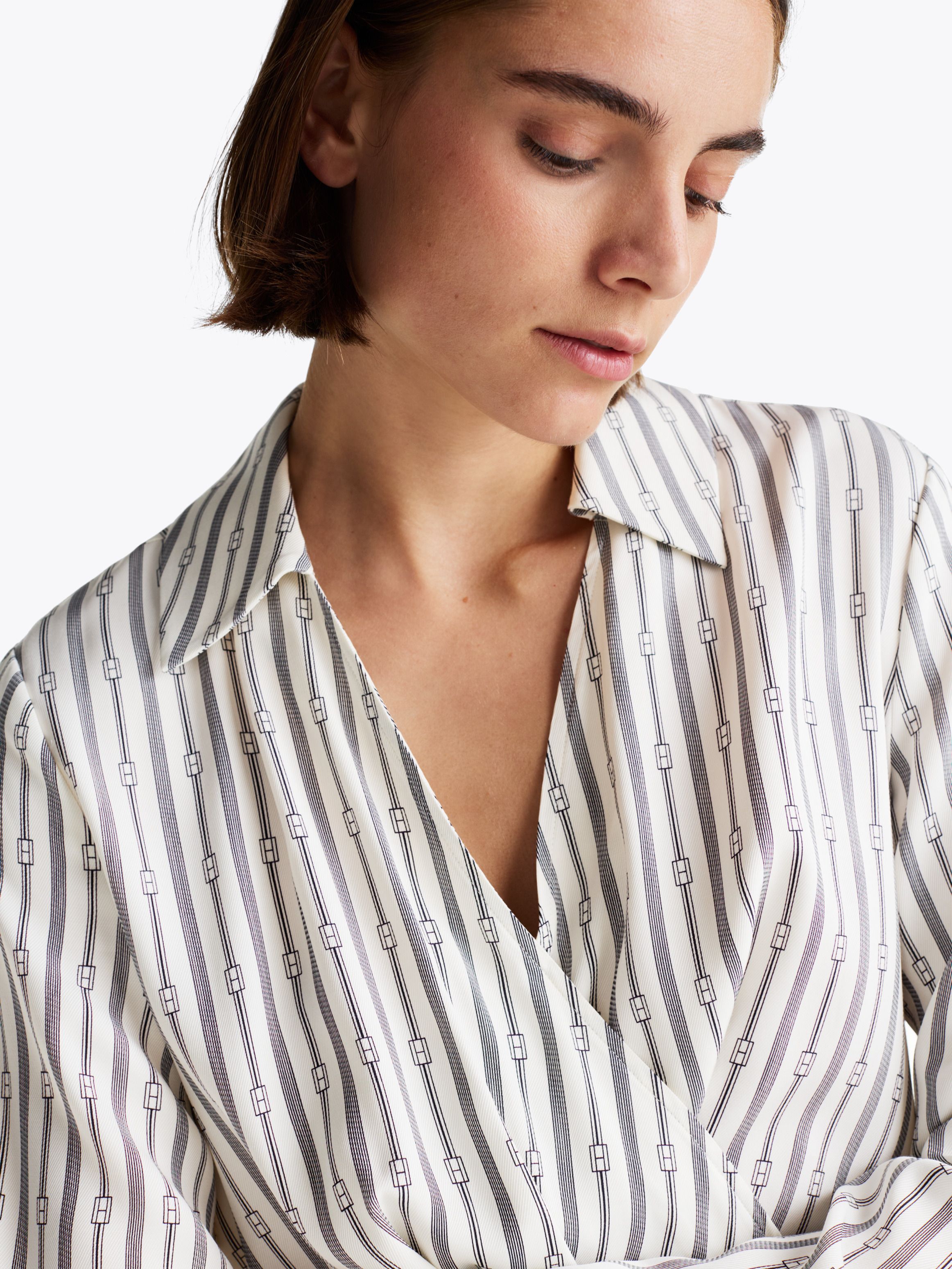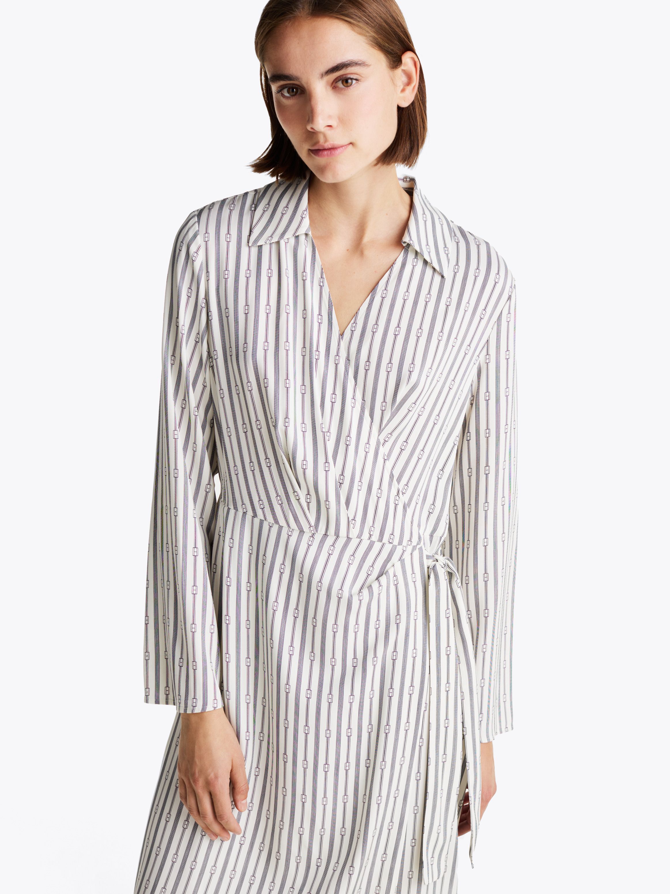 يستحضر هذا الفستان الملتف أجواء النوادي الريفية، مع حزام ذاتي للتقويم عند الخصر وياقة على شكل V.