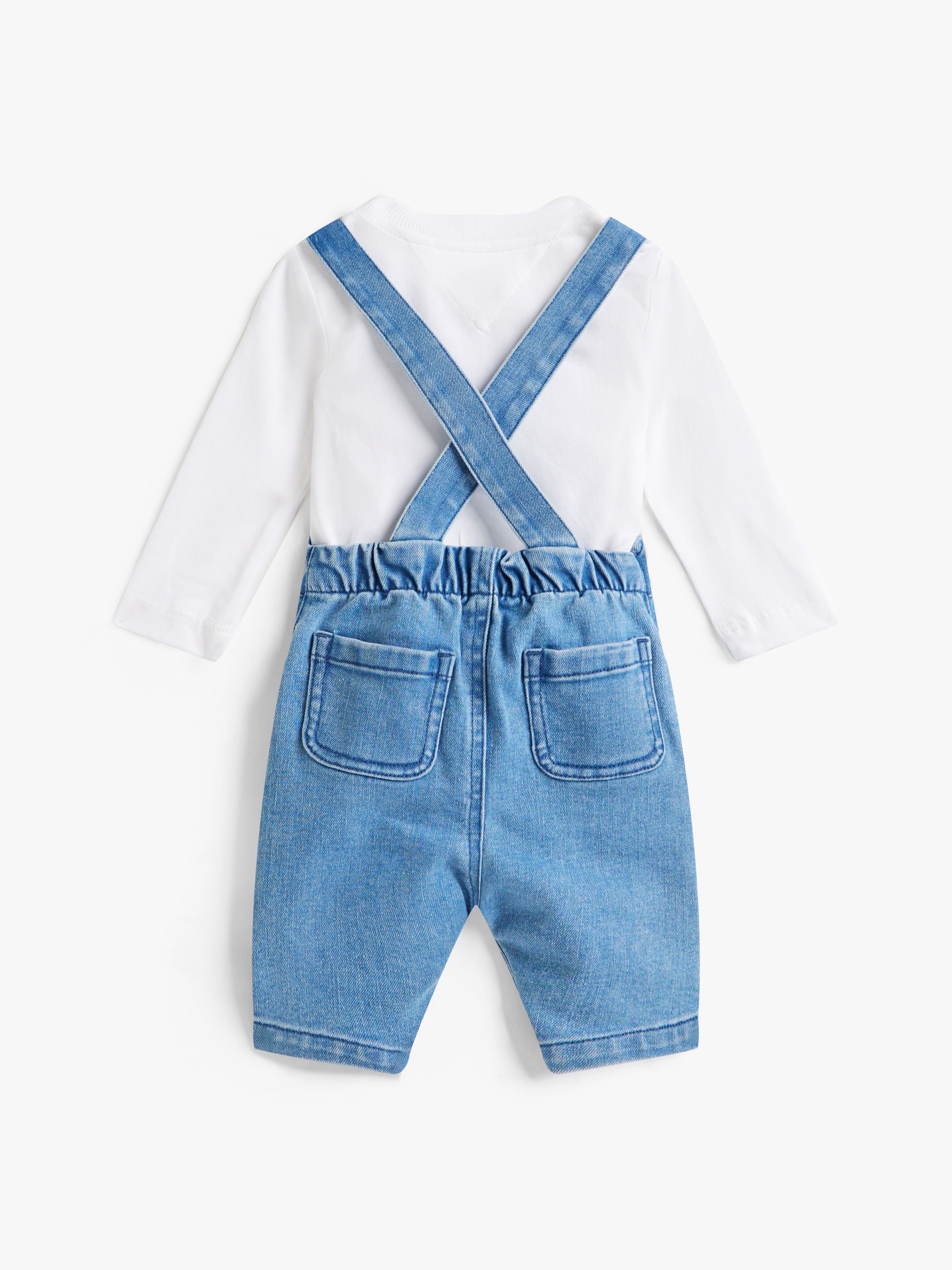 يأتي هذا الطقم اللطيف مكوّنًا من سالوبيت جينز مطاطي بقصّة مريحة مع حمالات قابلة للتعديل، إلى جانب تيشيرت بأكمام طويلة وملمس مضلّع لإطلالة ناعمة ومناسبة للأطفال. أبرز التفاصيل السالوبيت • دنيم مطاطي من مزيج القطن • حمالات قابلة للتعديل بإغلاق كبّاس • جيب صدري رقعي • جيبان جانبيان مائلان • جيبان خلفيّان • خصر خلفي مطاطي • شارة شعار تومي هيلفيغر على الجيب • علامة تومي هيلفيغر المميّزة • تطريز علم تومي هيلفيغر على الجانب التيشيرت • ملمس مضلّع • ياقة دائرية • إغلاق كبّاس على الكتف • شريط توقيعي على الجانب • علامة تومي هيلفيغر المميّزة