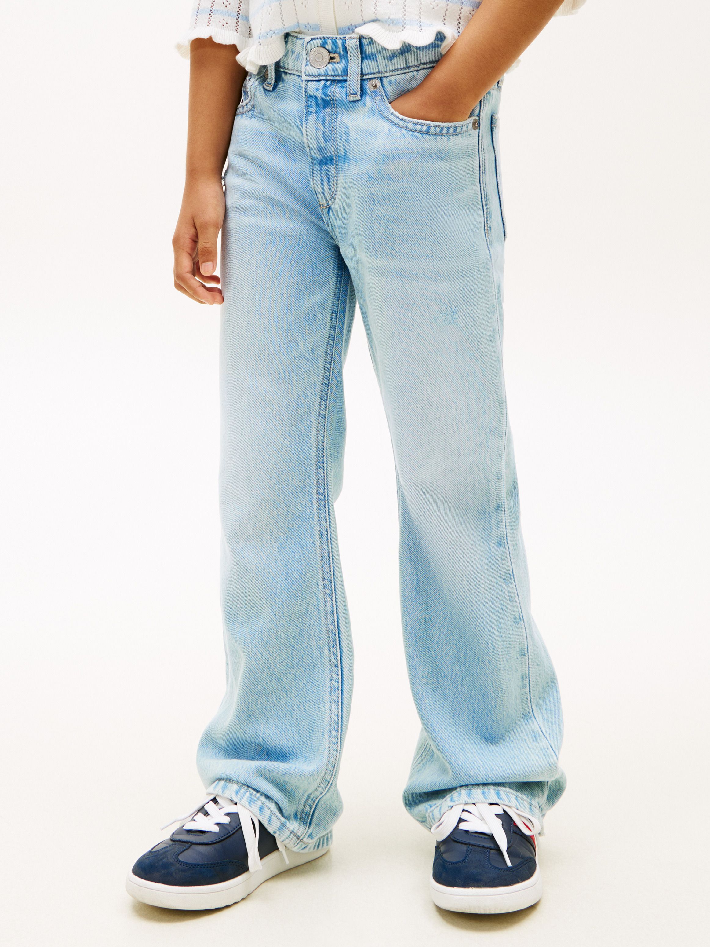 تم تصميم بنطلون الجينز هذا بقصة واسعة مستوحاة من الطابع الكلاسيكي مع تأثيرات مهترئة، ومصنوع من دنيم قطني مخلوط مع لمسة مطاطية لراحة إضافية.