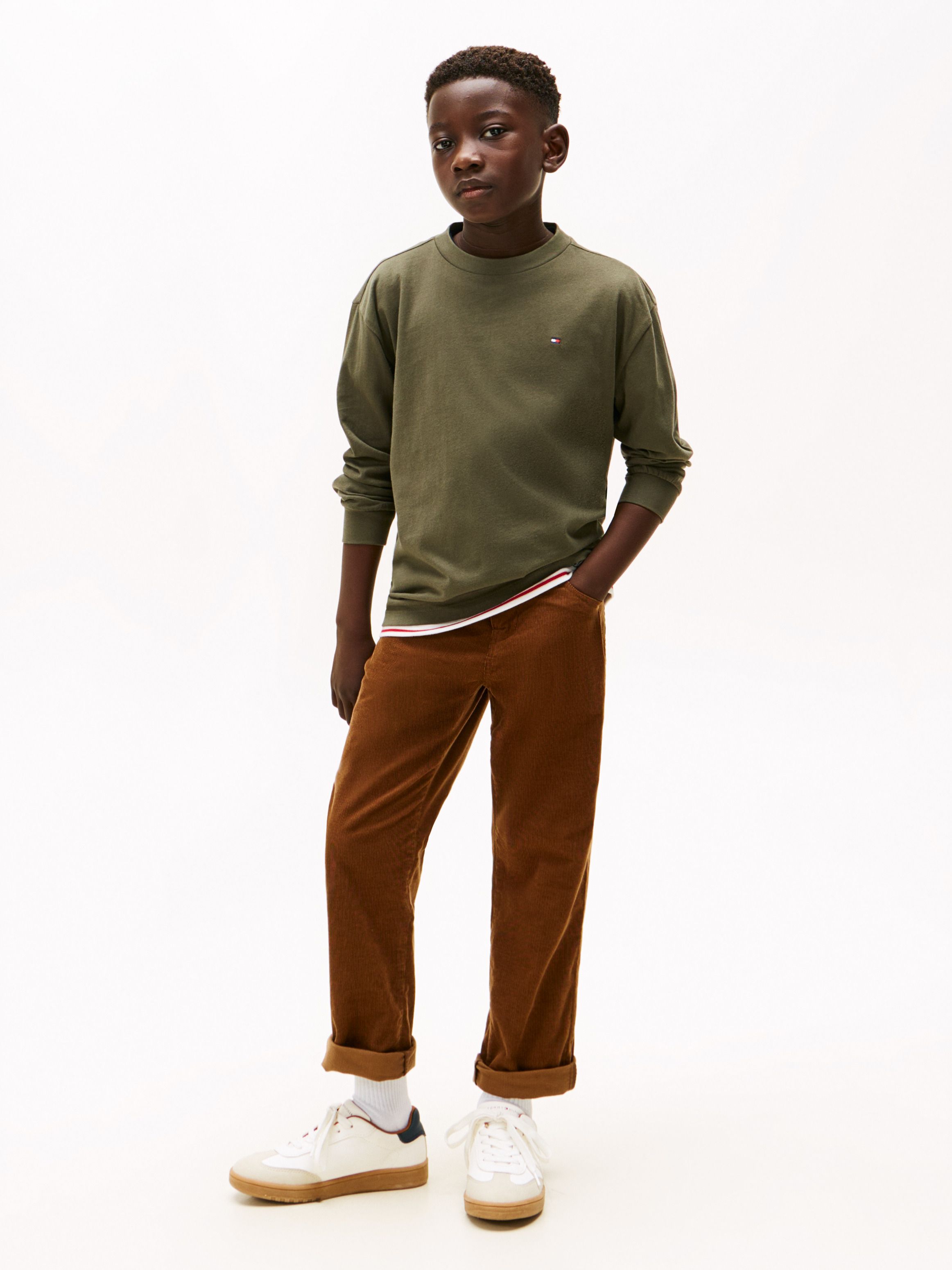 تمتع بإطلالة مريحة وعصرية مع تيشيرت الجيرسي بأكمام طويلة، يتميز بياقة دائرية تقليدية وأكتاف منخفضة تضيف لمسة كاجوال، مع تفاصيل تحمل توقيع Tommy Hilfiger تعزز من أناقته اليومية.