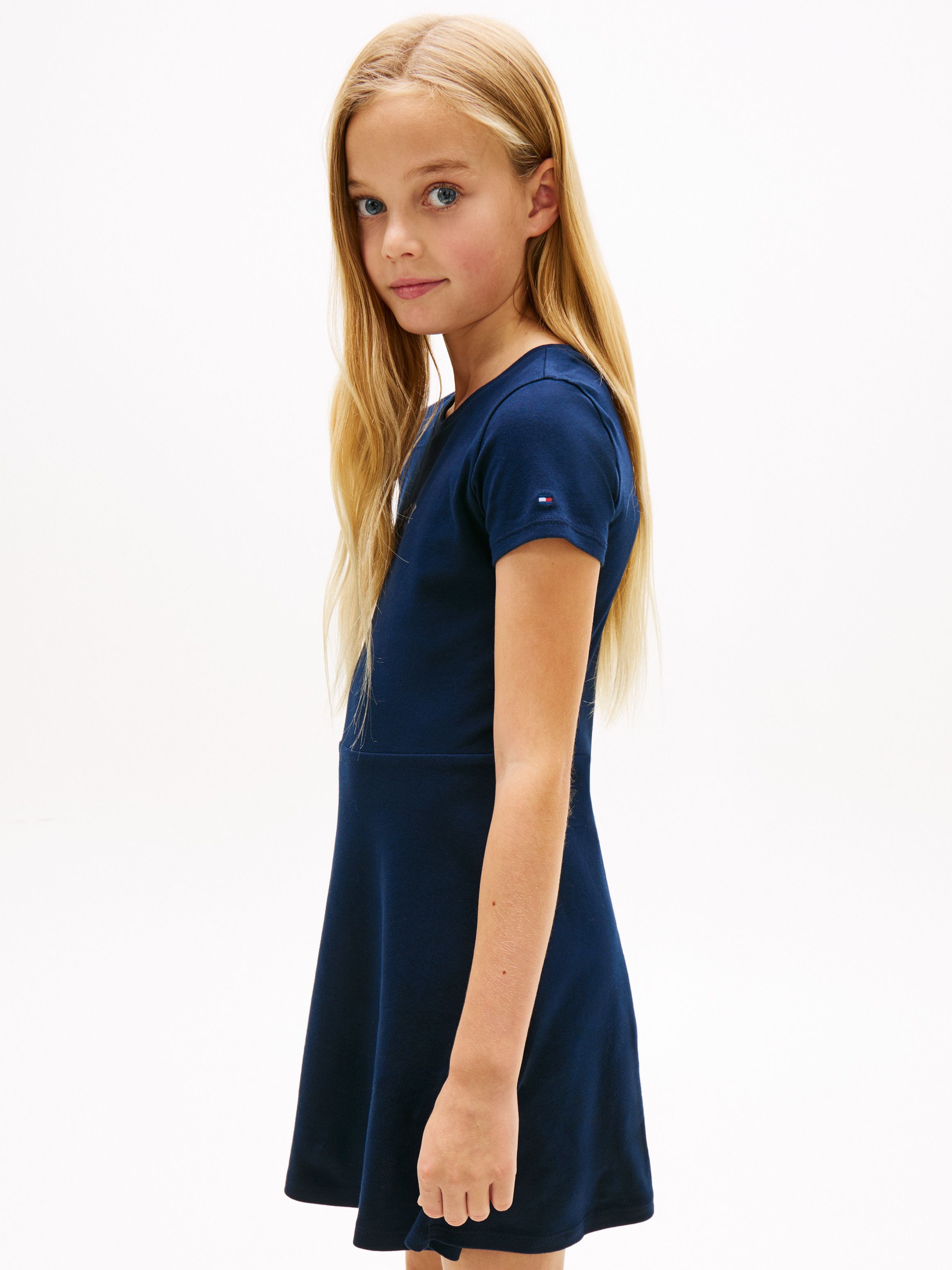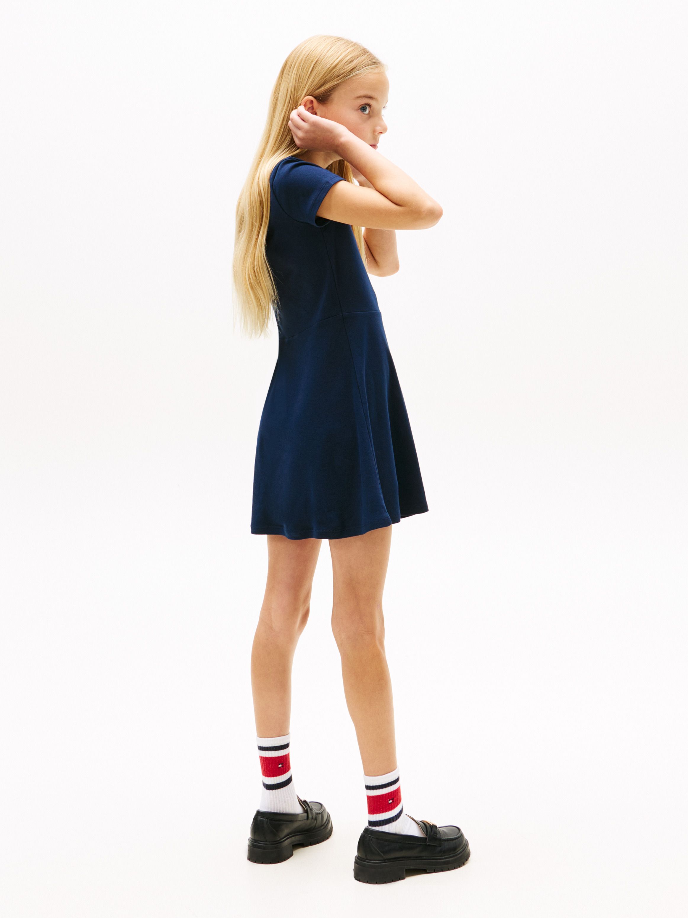 يأتي هذا الفستان المصنوع بالكامل من القطن بتصميم سكيتر كلاسيكي بتنورة واسعة، مع لمسات مميّزة من الشعار على الصدر تمنحه إطلالة راقية.