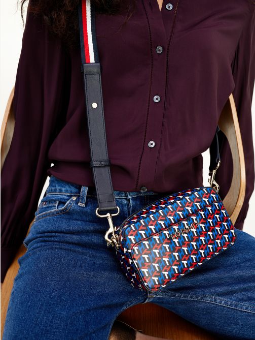 • ملمس ناعم • شعار تومي هيلفيغر معدني في المقدمة • سحّاب للإغلاق • حزام كروس قابل للتعديل والإزالة • جزء رئيسي واحد • جيب داخلي • مزيّنة باللون الذهبي • علامة تومي هيلفيغر