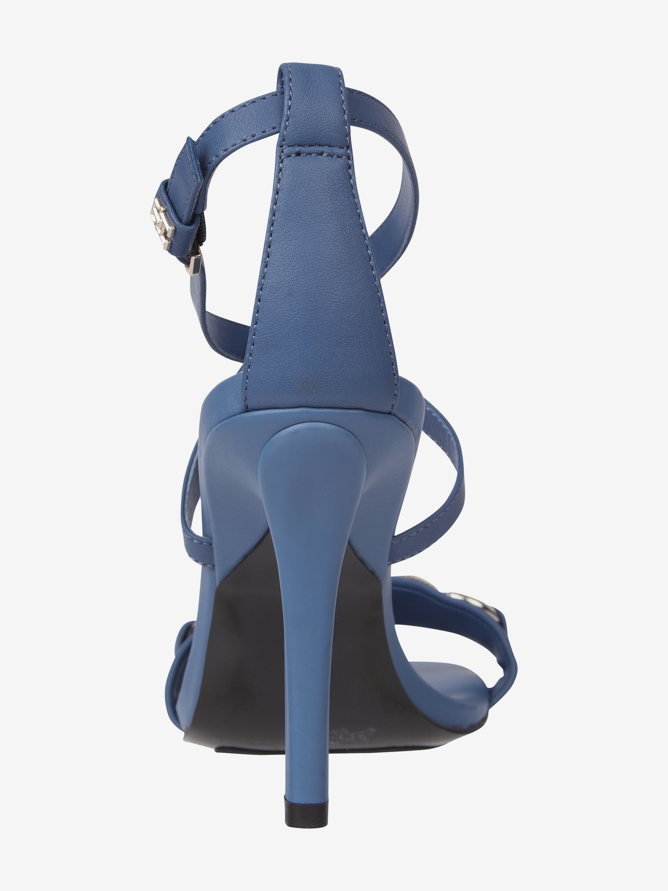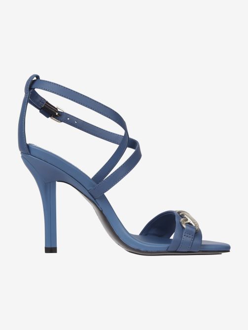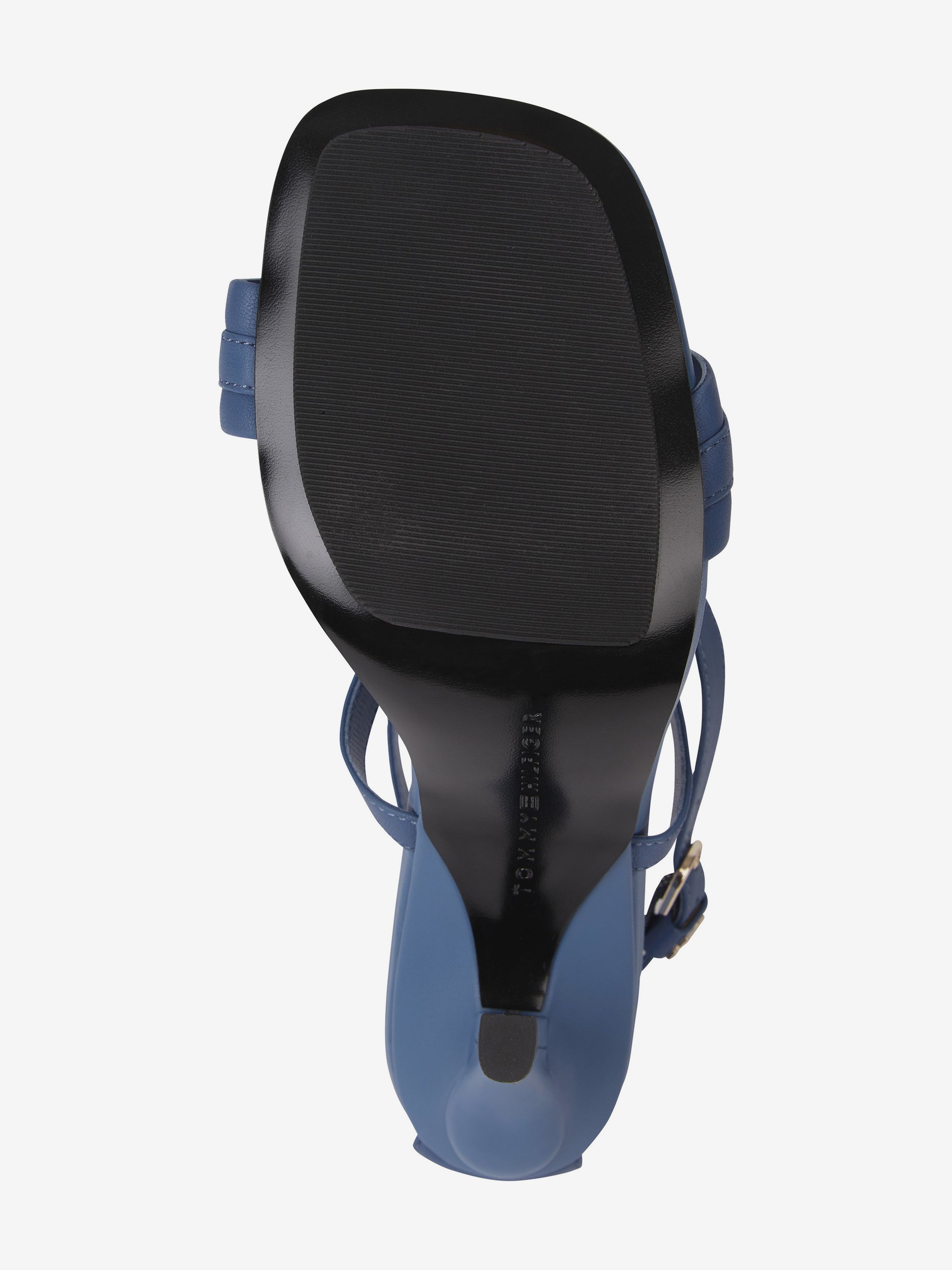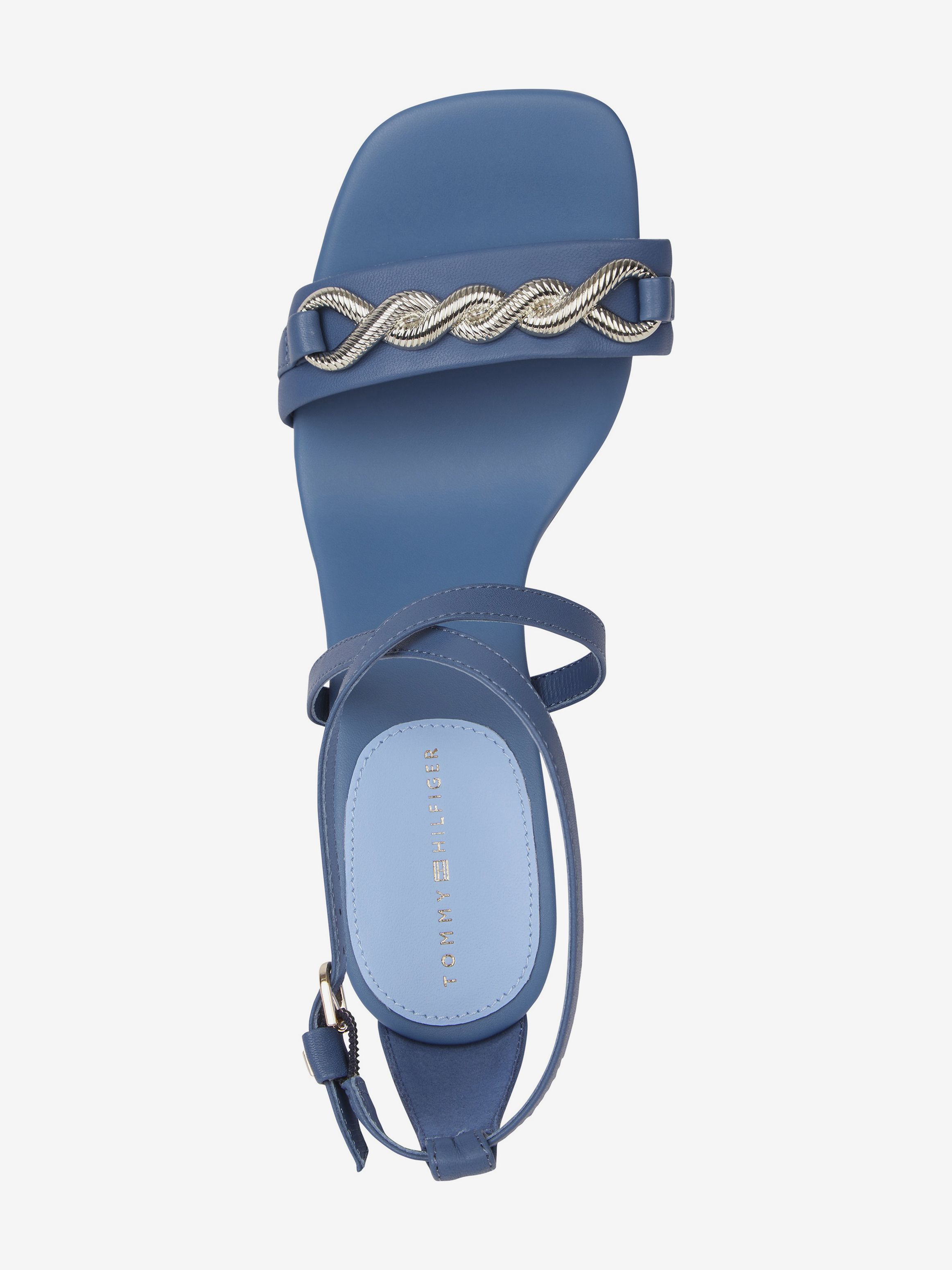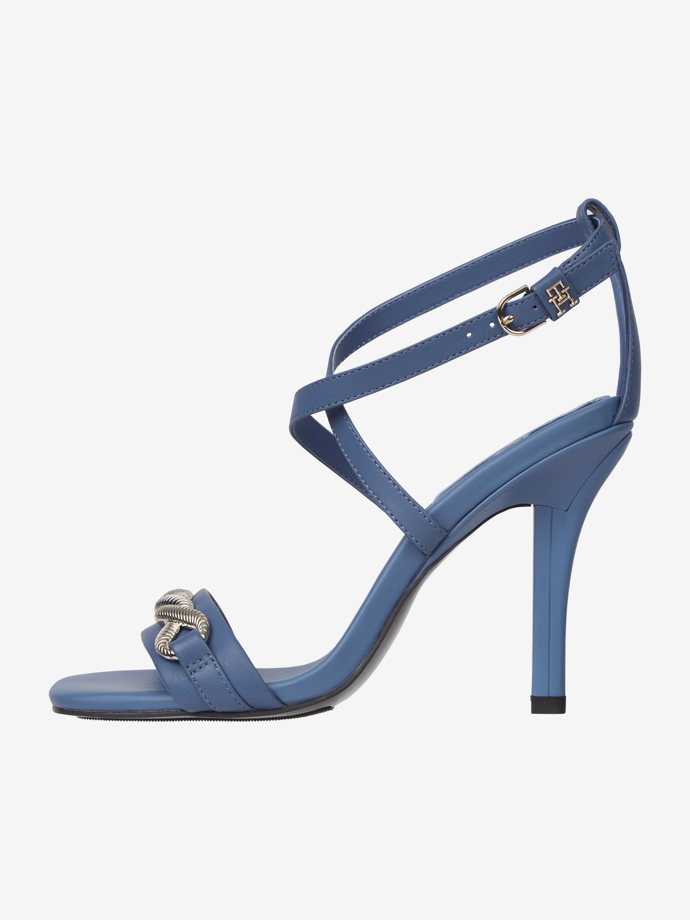 • جزء علوي من الجلد • بطانة جلدية • نعل خارجي من المطاط الطبيعي والبولي يوريثين • تفاصيل سلسلة على حزام إصبع القدم • كعب رفيع • يُغلق بإبزيم • لوحة حروف الشعار على حزام الكاحل • علامة تومي هيلفيغر التجارية