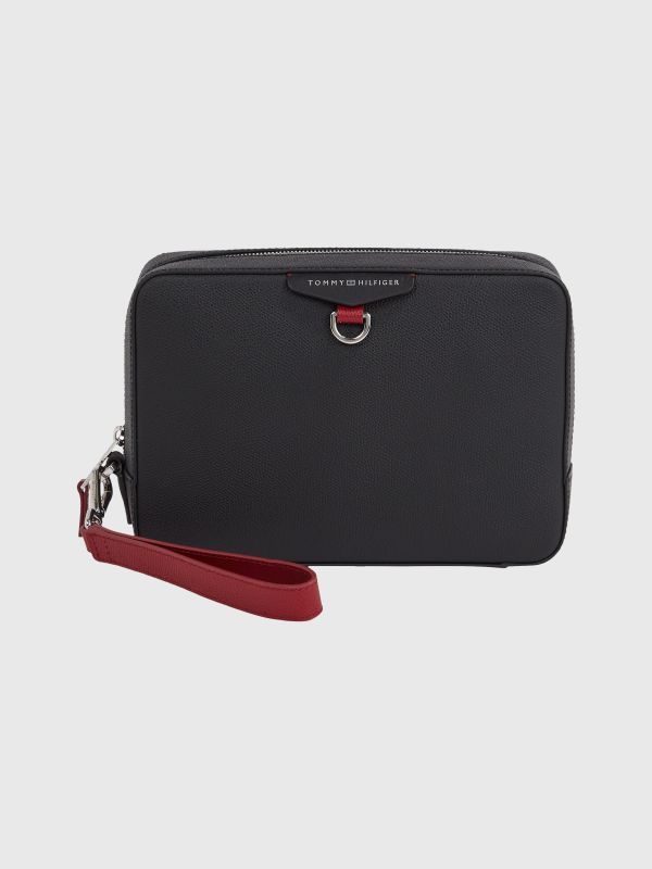 • جلد • صُنعت من مجموعة أعمال الجلد • ملمس حبيبات خشن • تُغلق بسحاب • حزام جانبي واحد • جزء رئيسي واحد • حلقة مفاتيح على شكل حرف D من الأمام • علامة تومي هيلفيغر التجارية