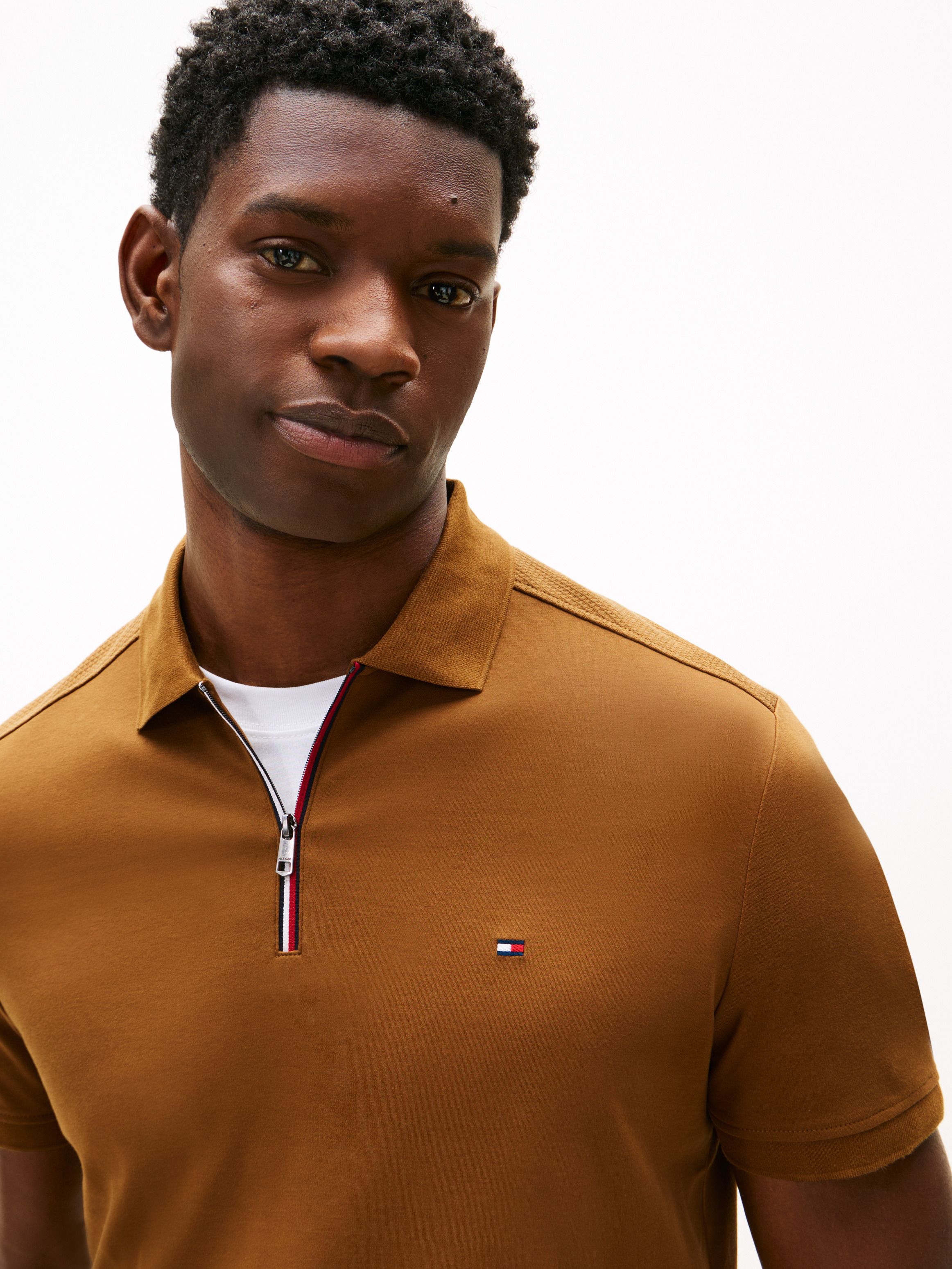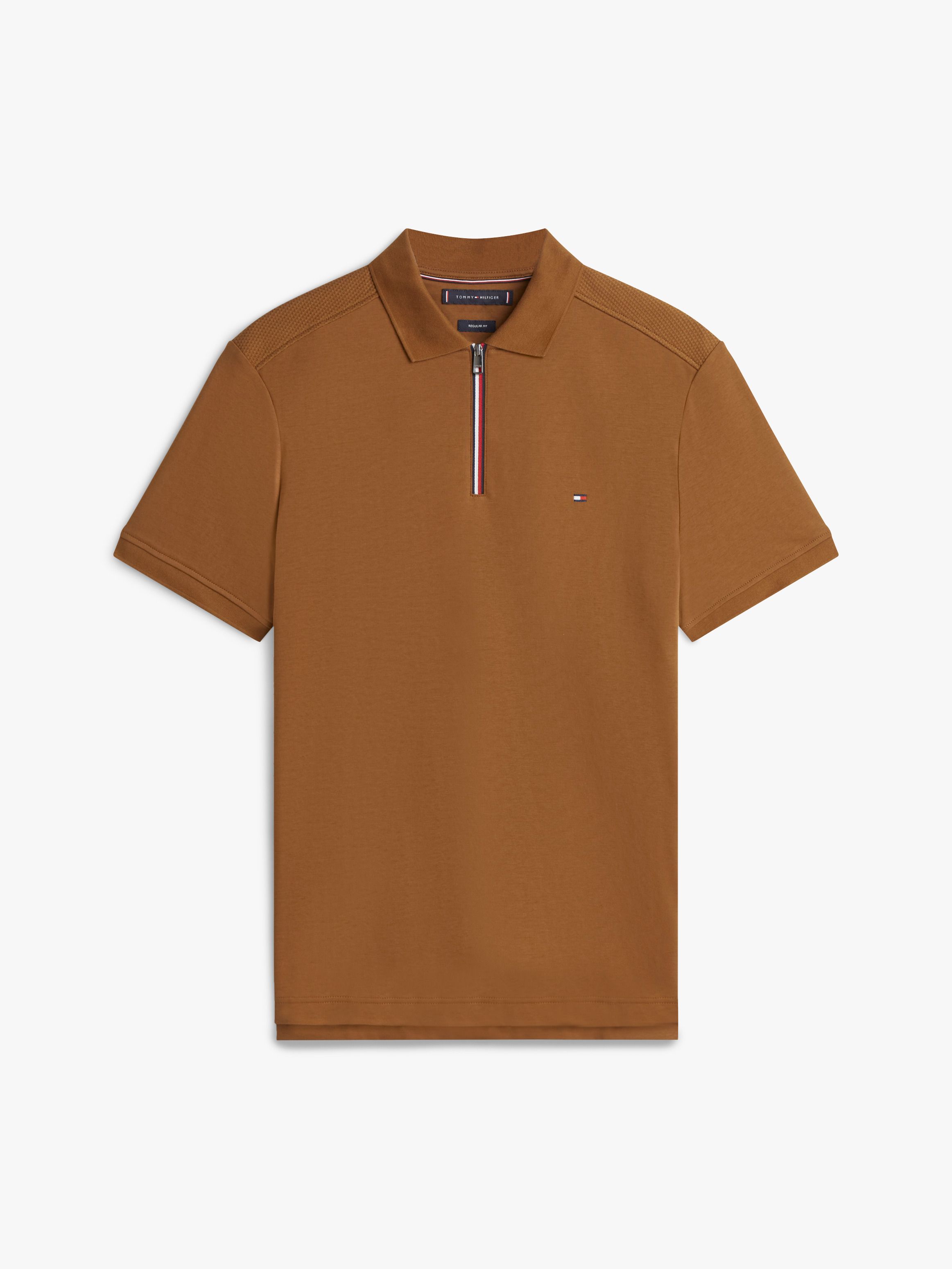 • قميص بولو قطني بسحاب وأكمام قصيرة بحواف حمراء وبيضاء وزرقاء