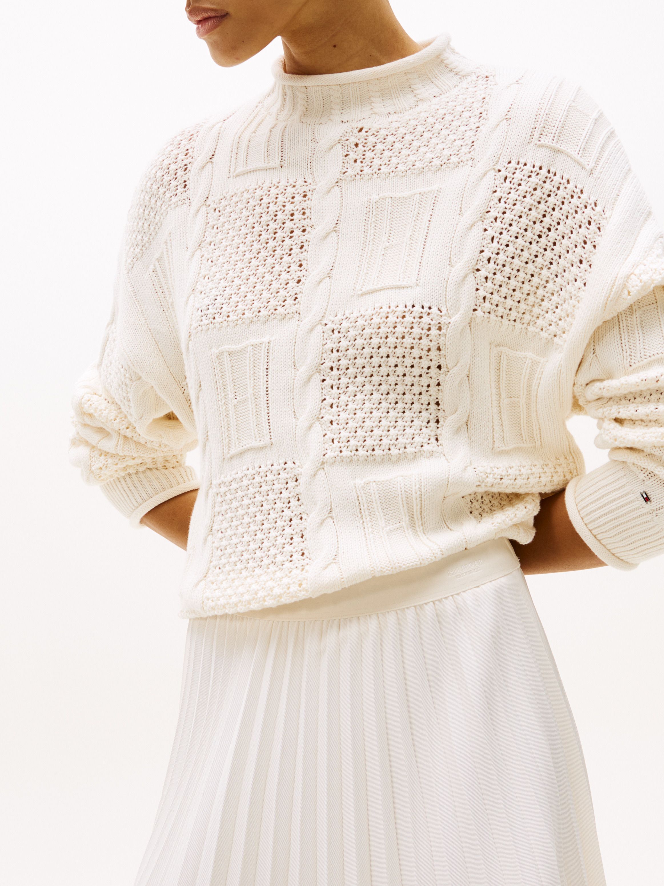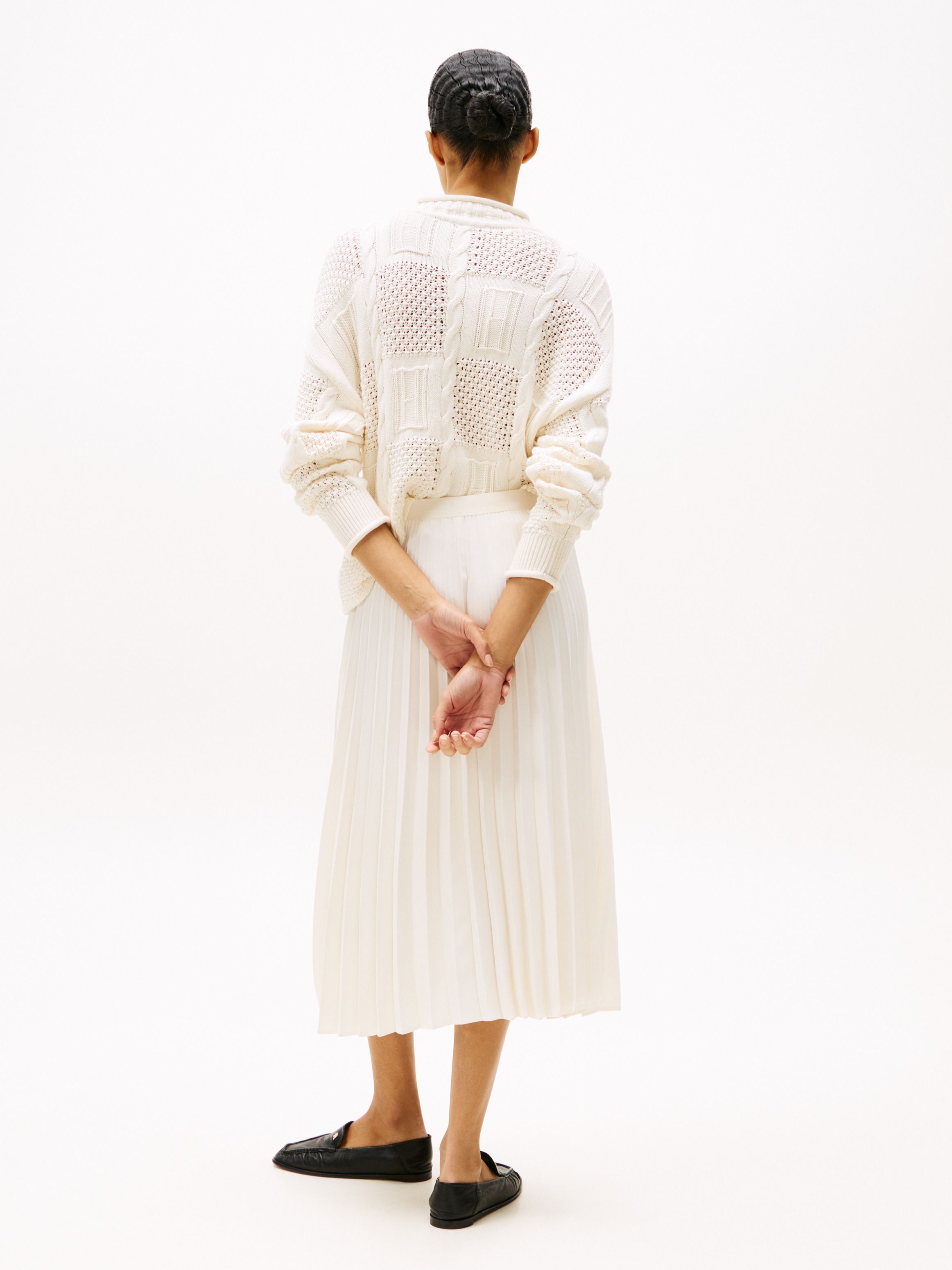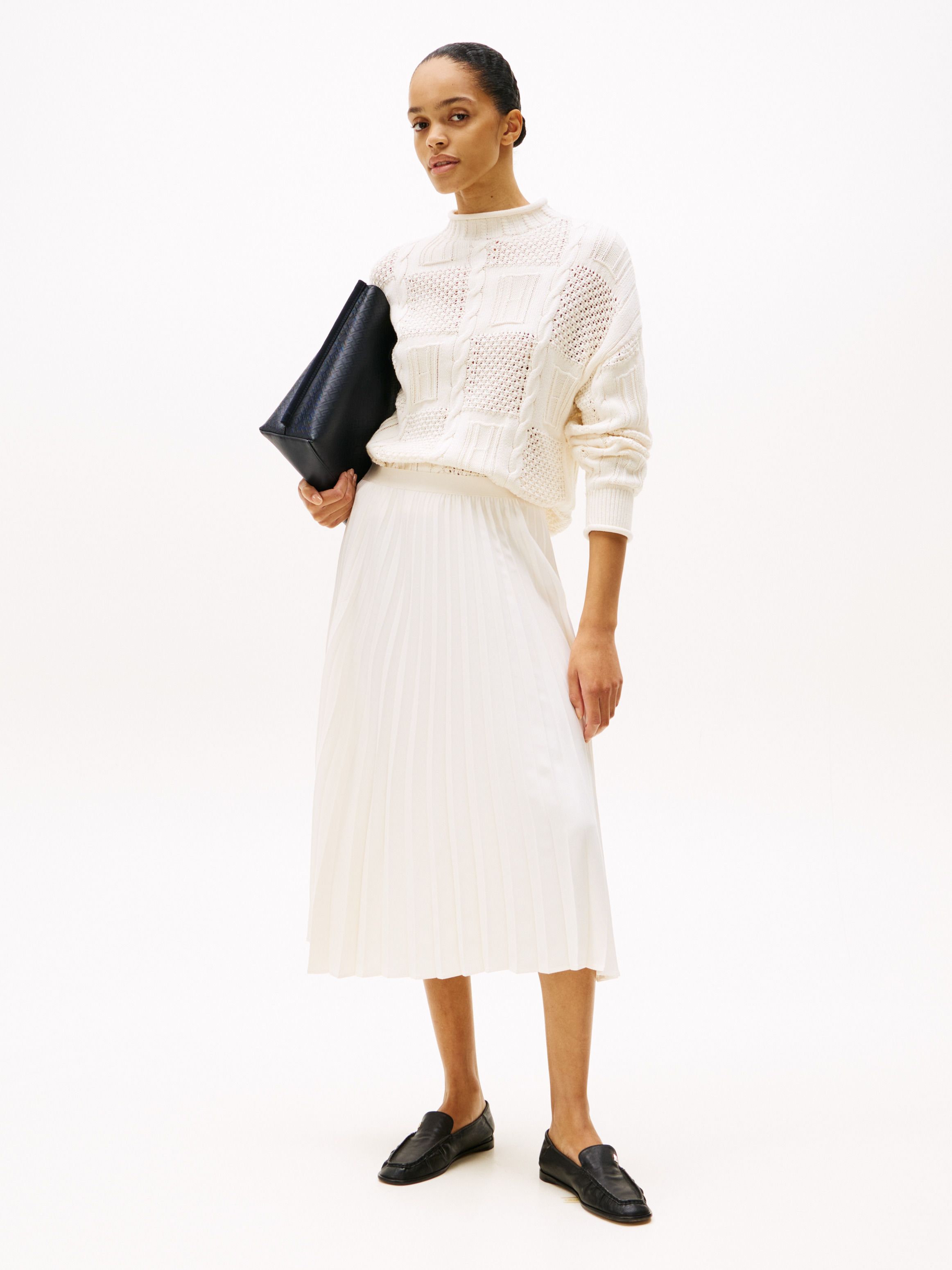 تجمع هذه التنورة متوسطة الطول بين اللمسات الرياضية والأناقة البسيطة، مع ثنيات أنثوية وإطار خصر مرن مزين بشعار "تومي هيلفيغر".