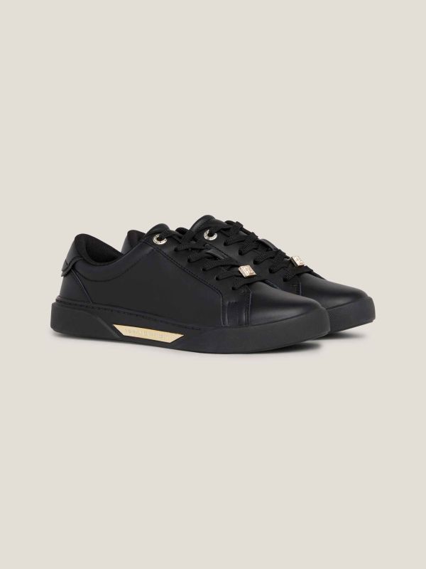 أضيفي لمعة أنيقة إلى إطلالتك مع حذاء سنيكرز جلد يتميز بعلامة تجارية معدنية على النعل الأوسط والأربطة.