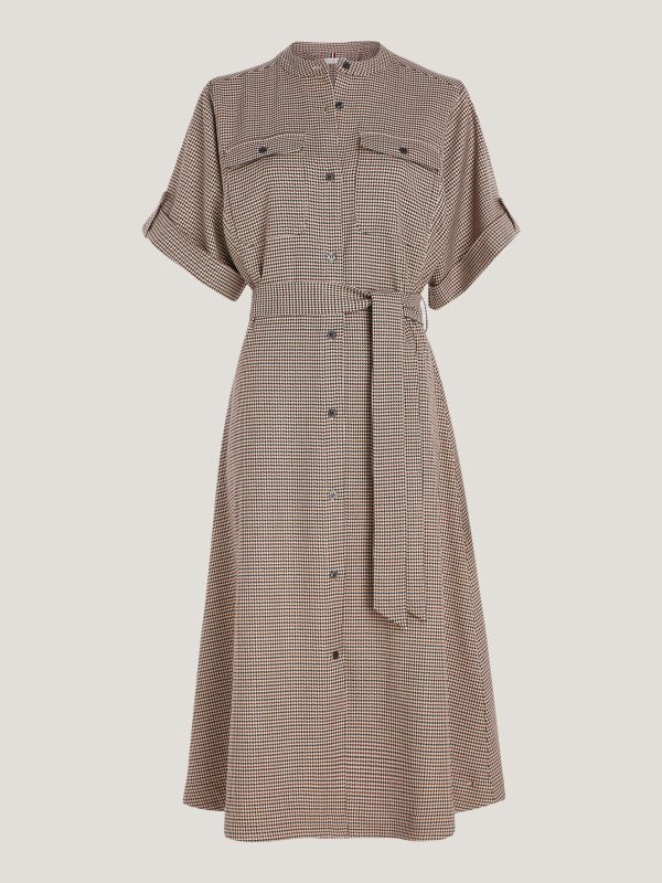 يتميز فستان قميص ميدي بخصر ضيق وتنورة واسعة مما يضيف لمسة أنيقة وميزة إلى مظهرك، بالإضافة إلى طبعة الكاروهات الصغيرة المستوحاة من التصميم التراثي.