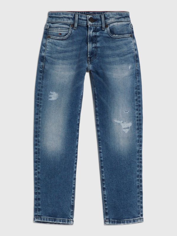 • مزيج الجينز القطني المطاطي • أجزاء ممزقة في الأمام • أجزاء باهتة في الأمام والخلف • تصميم بخمسة جيوب • علامة تومي هيلفيغر التجارية • تطريز علم تومي هيلفيغر على الأمام والخلف