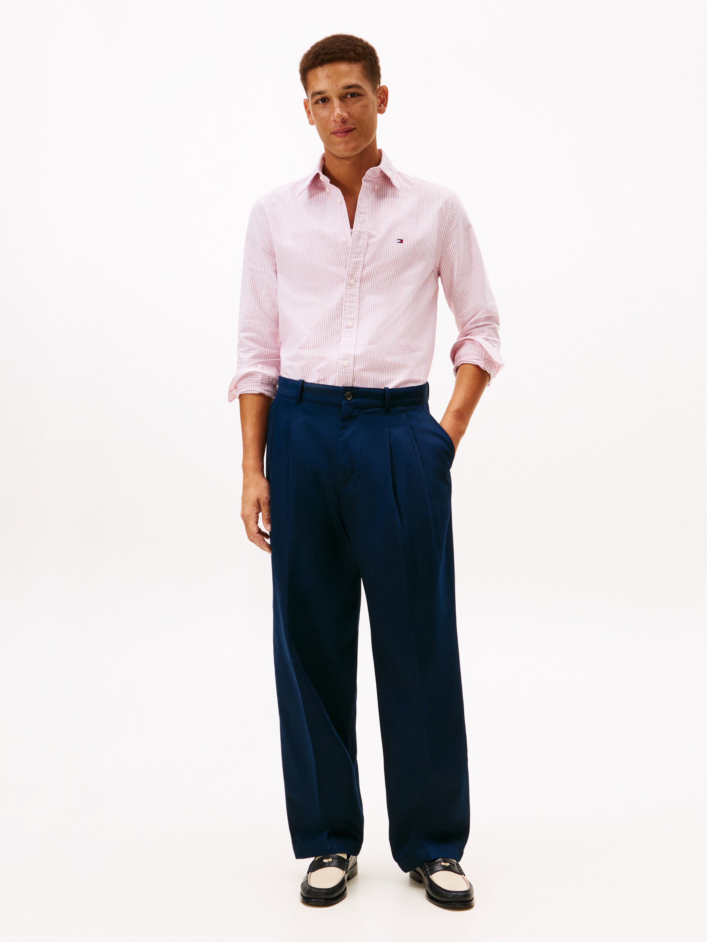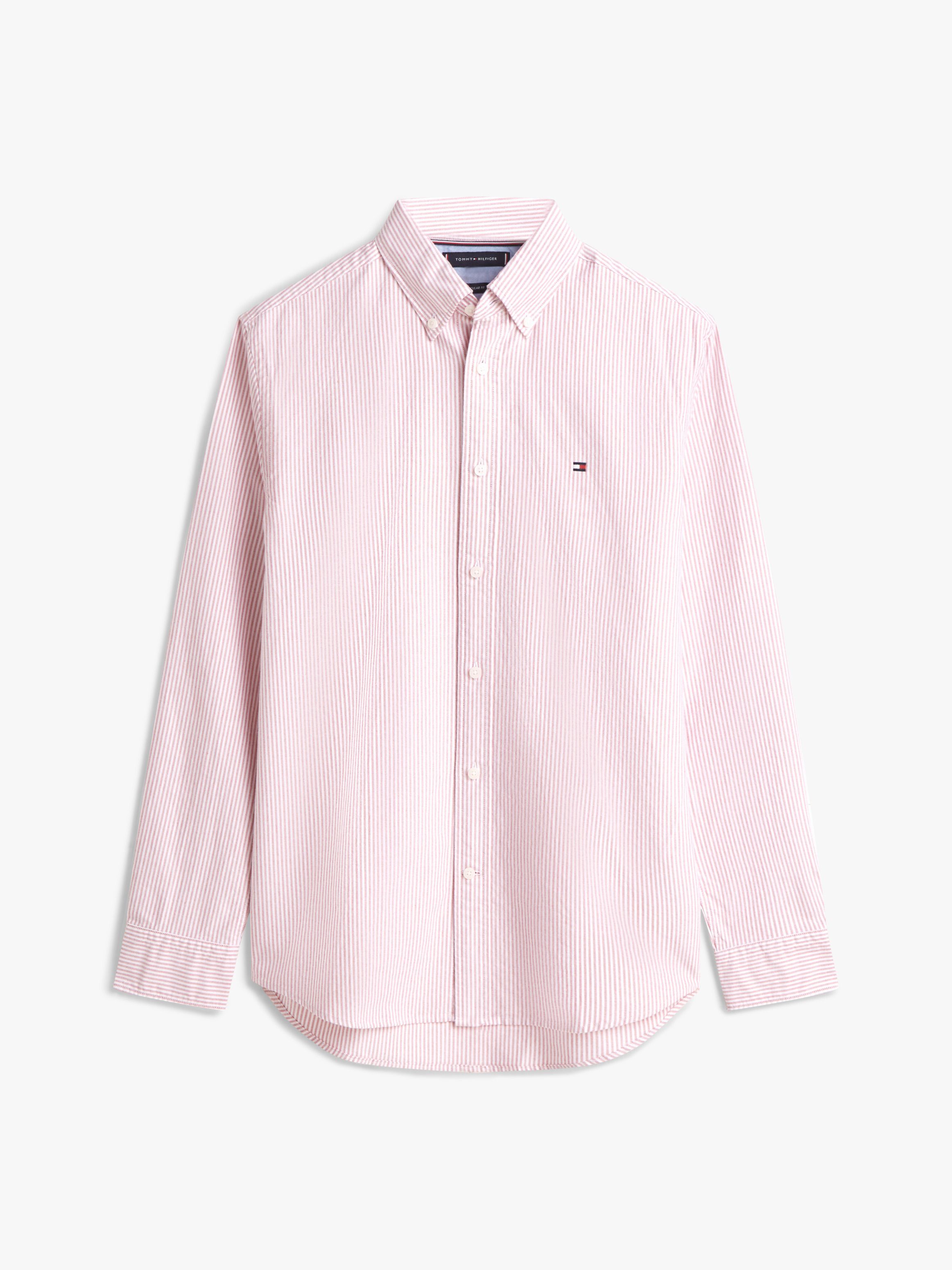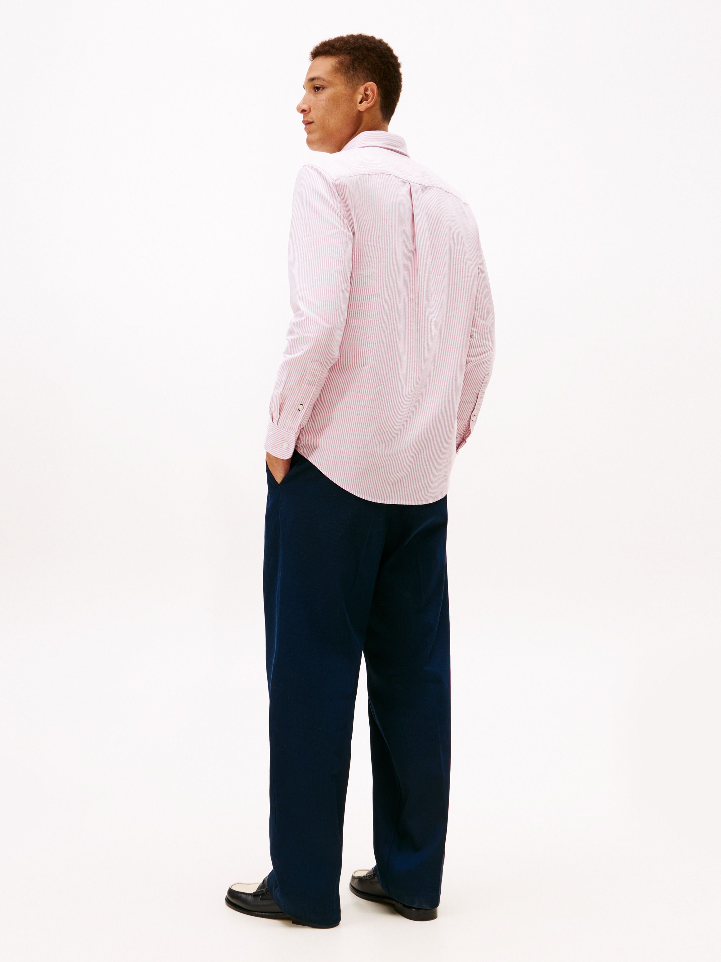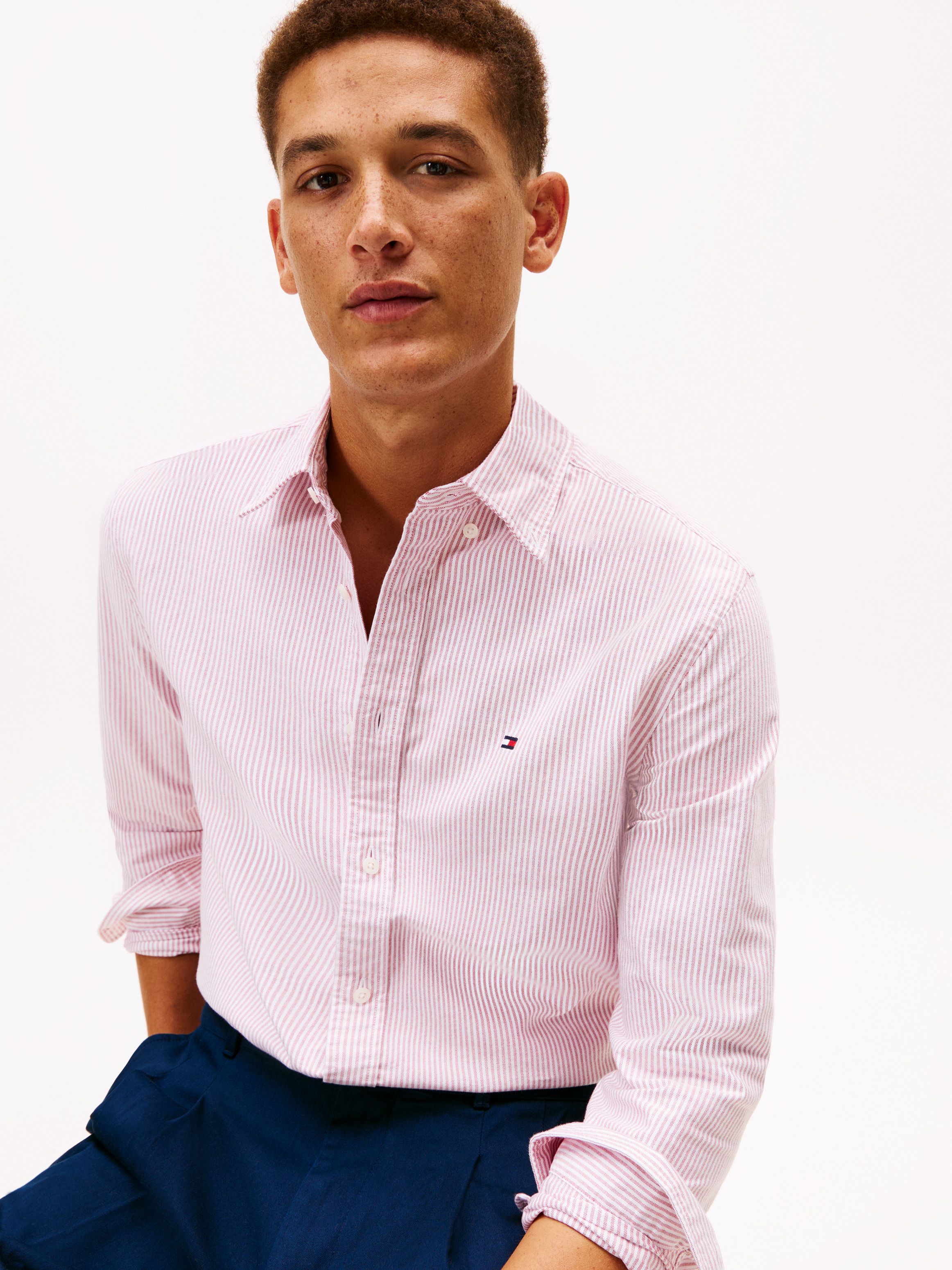 أضِف لمسة نقشة أنيقة إلى إطلالاتك الكلاسيكية مع هذا القميص المصنوع من قماش أكسفورد بنقشة خطوط عمودية بالكامل.