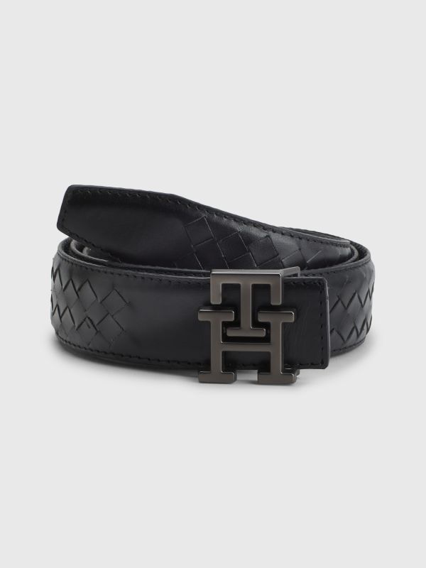• جلد مدبوغ • من مجموعة أعمال التصميم الجلدية • بوجهين • ملمس ناعم على جانب واحد • ملمس حبيبات خشن على الجهة الخلفية • إبزيم مزين بحروف الشعار • علامة تومي هيلفيغر التجارية