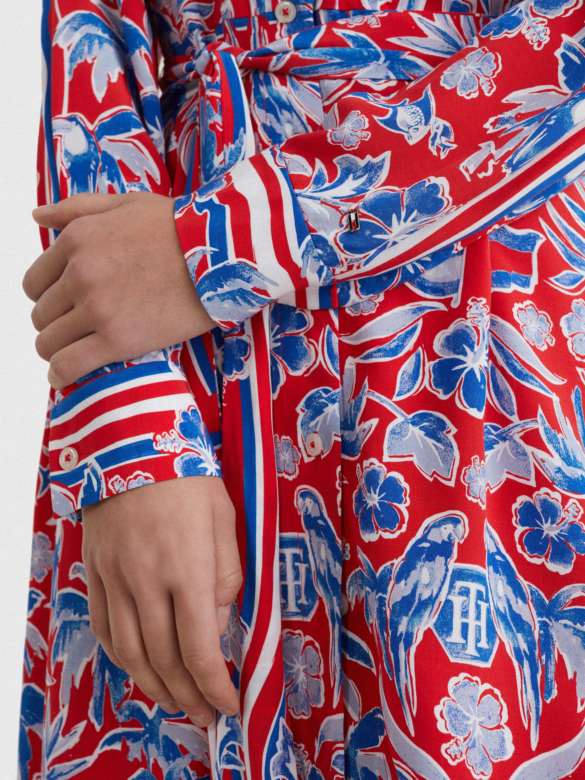 يضيف هذا الفستان القميص لمسة أنيقة إلى مظهرك حيث أنه مزين بطبعة استوائية رائعة تتمثل في أشجار النخيل والزهور.