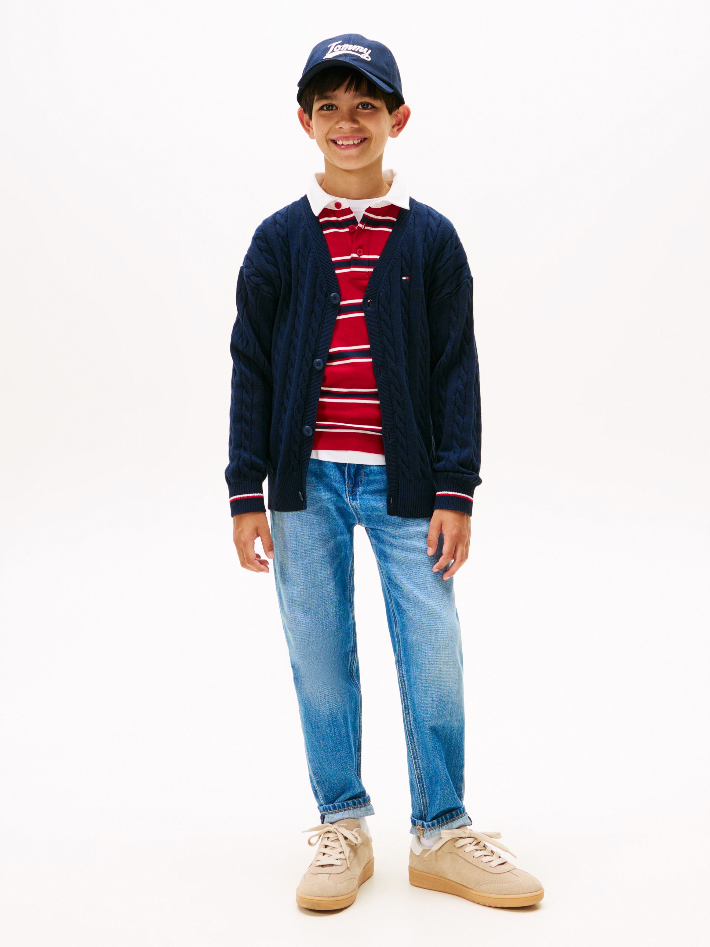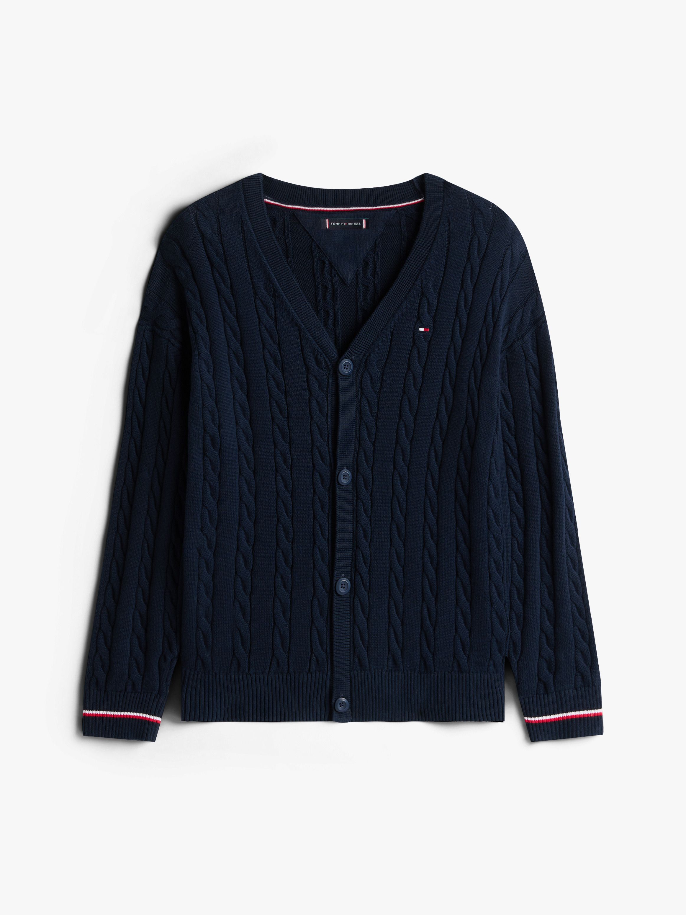 يُعد هذا الكارديجان المحبوك من القطع الكلاسيكية المثالية لإطلالة مستوحاة من أجواء العودة إلى المدرسة. يتميز بتصميم من القطن النقي المحبوك بكابلات أنيقة، مع ياقة على شكل V وتفاصيل توقيع العلامة التي تضيف لمسة مميزة.