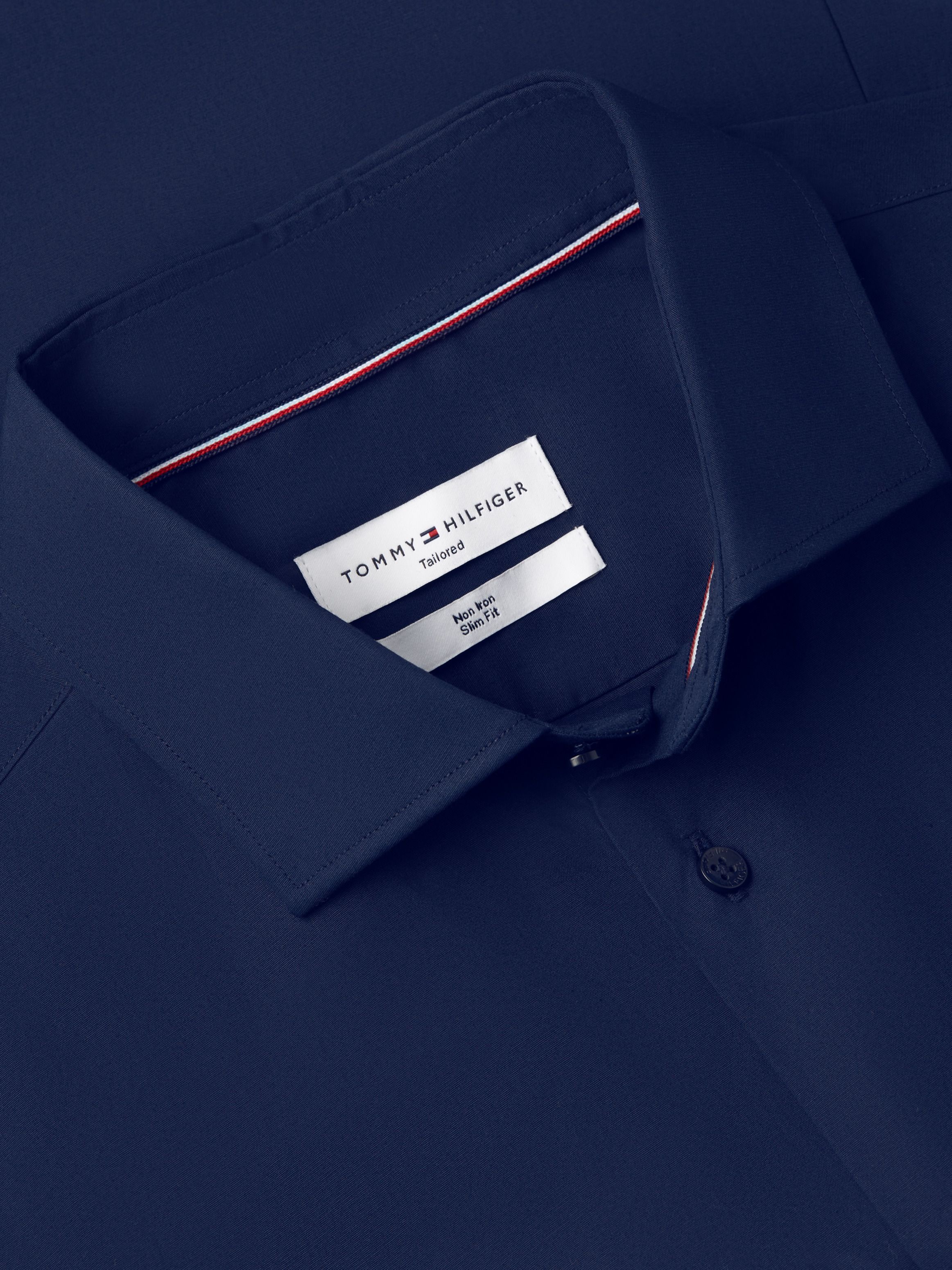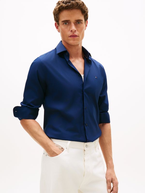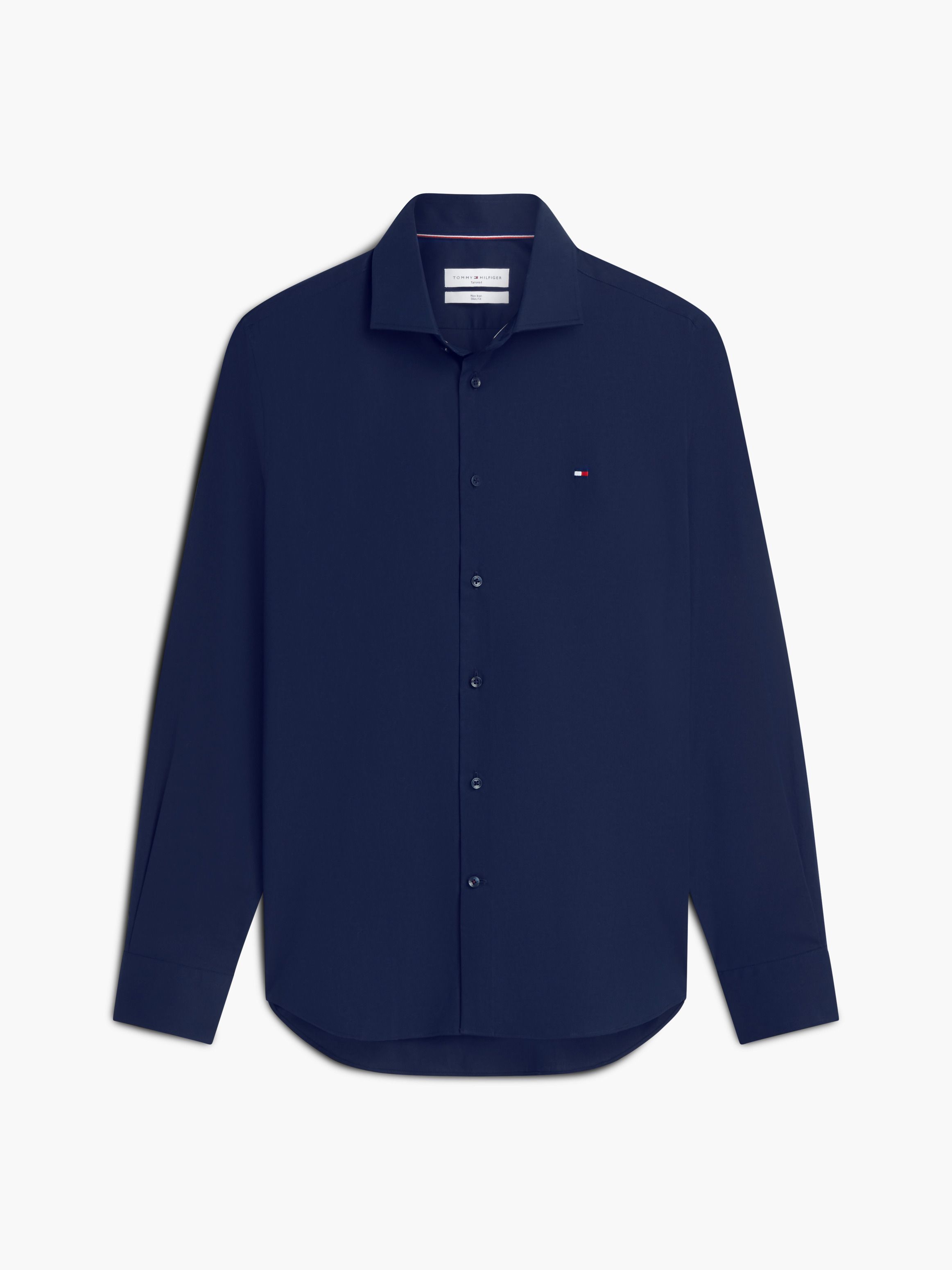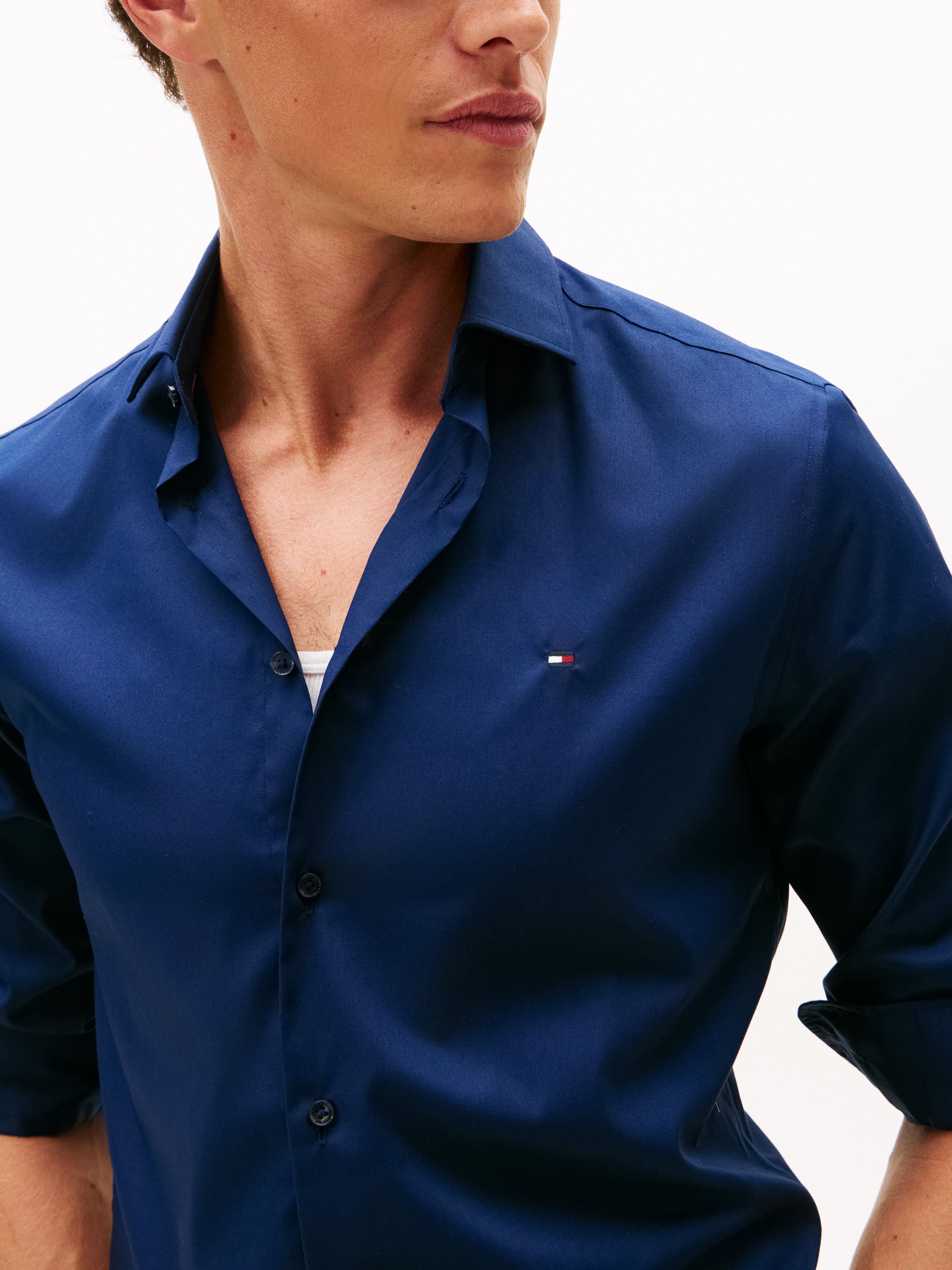 قميص بوبلين بقصة ضيقة غير قابل للكي، مصنوع من قطن مطاطي سهل العناية بتصميم كلاسيكي لإطلالة أنيقة في الأيام المزدحمة.