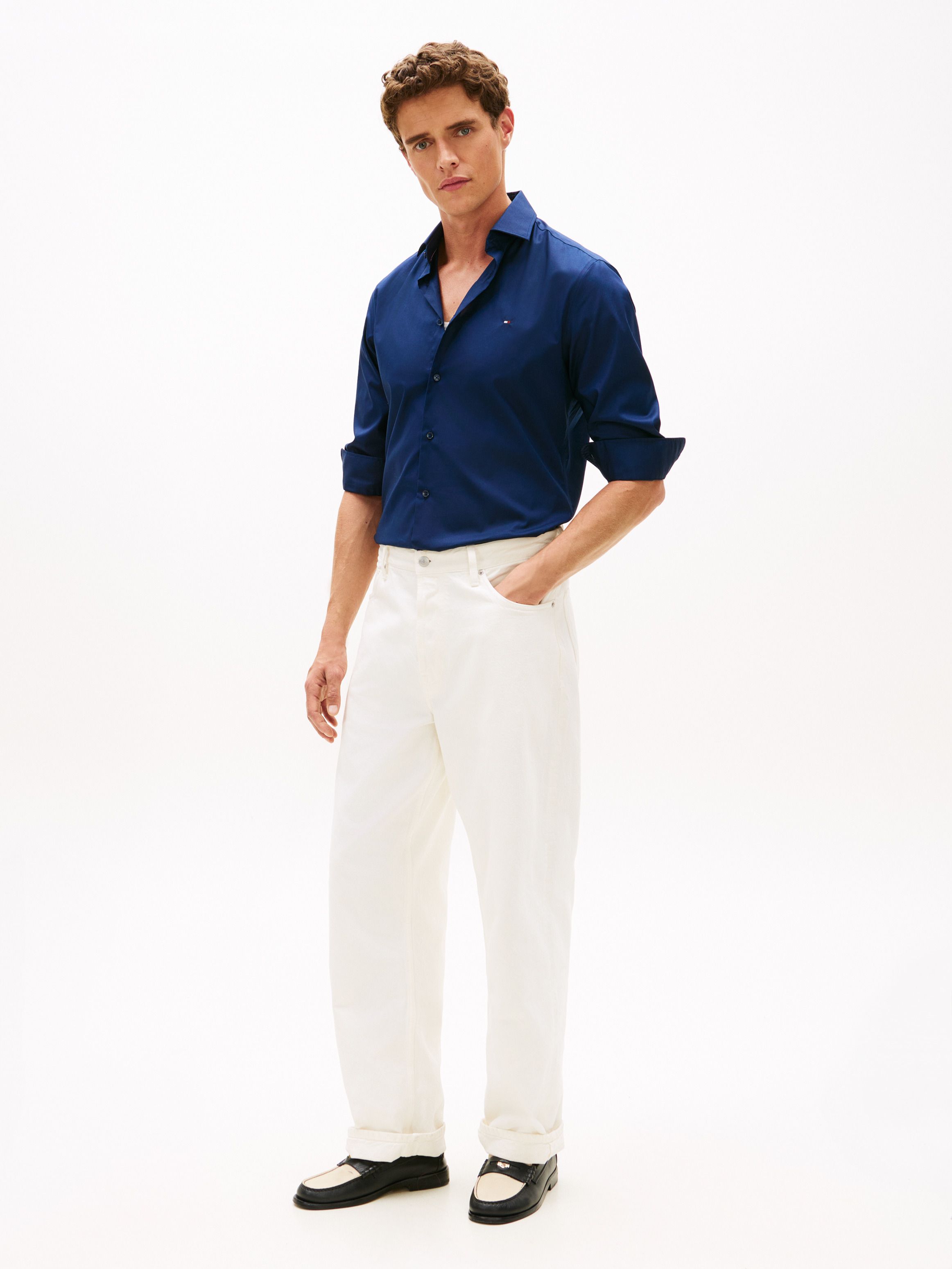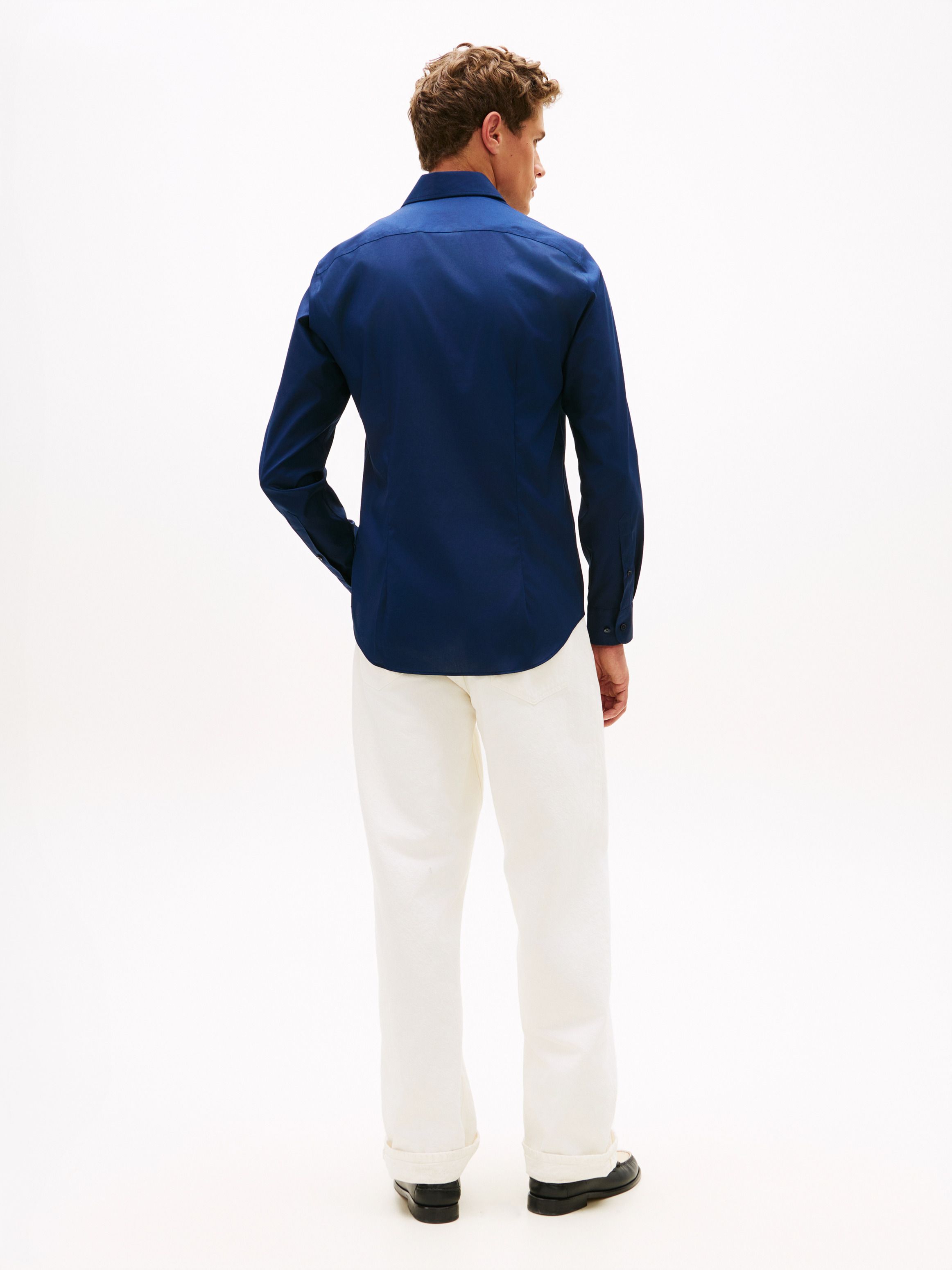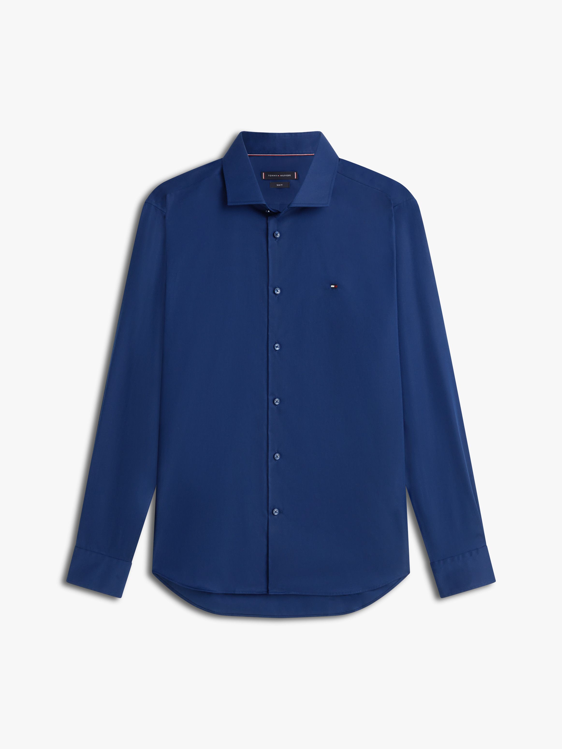 قميص بوبلين بقصة ضيقة غير قابل للكي، مصنوع من قطن مطاطي سهل العناية بتصميم كلاسيكي لإطلالة أنيقة في الأيام المزدحمة.
