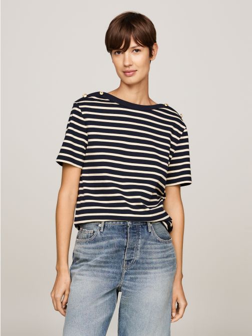تألقي بإطلالة مستوحاة من الأزياء البحرية مع هذا التيشيرت المخطط الذي يتميز بياقة واسعة وأزرار ذهبية على الأكتاف.
