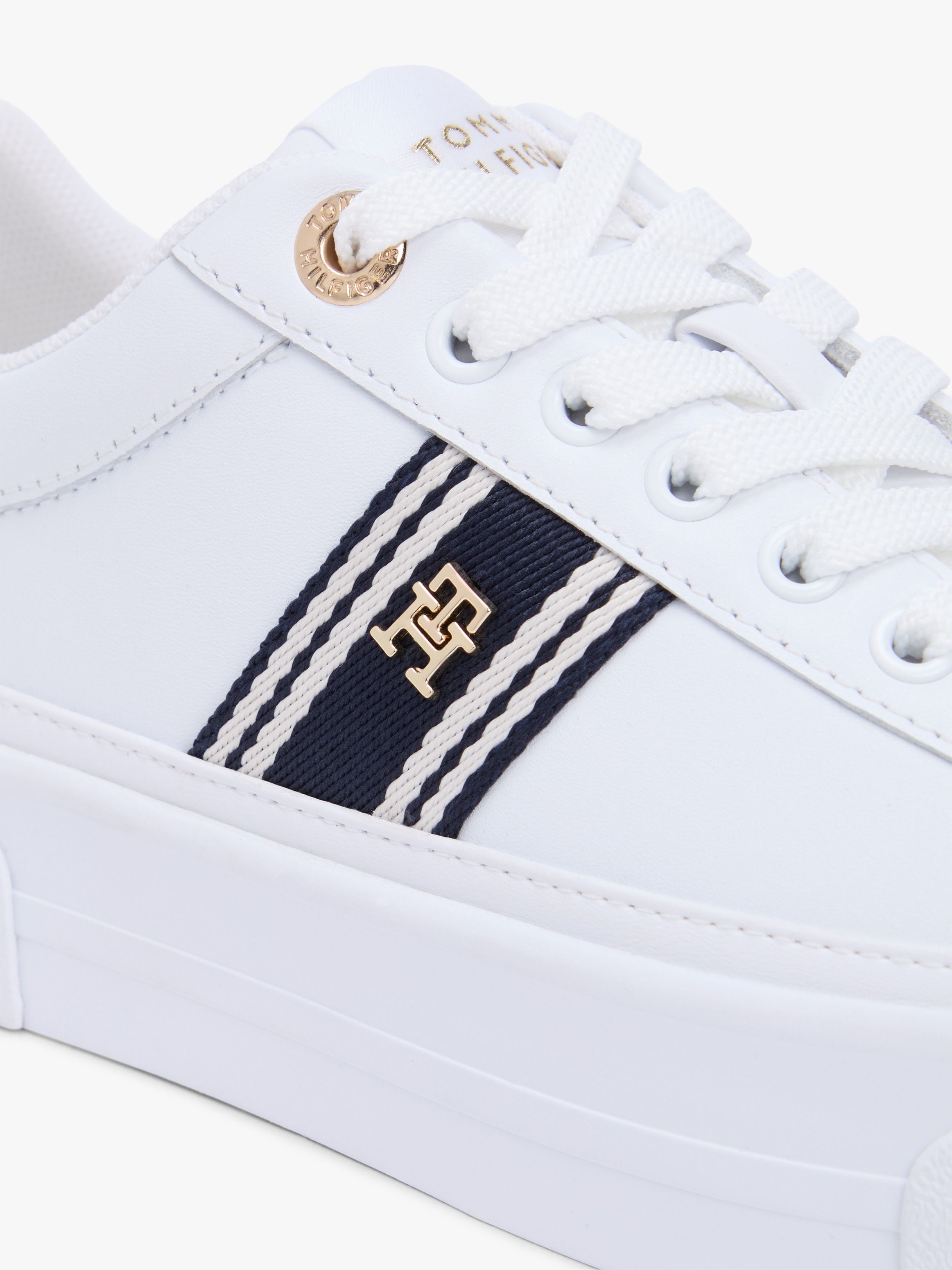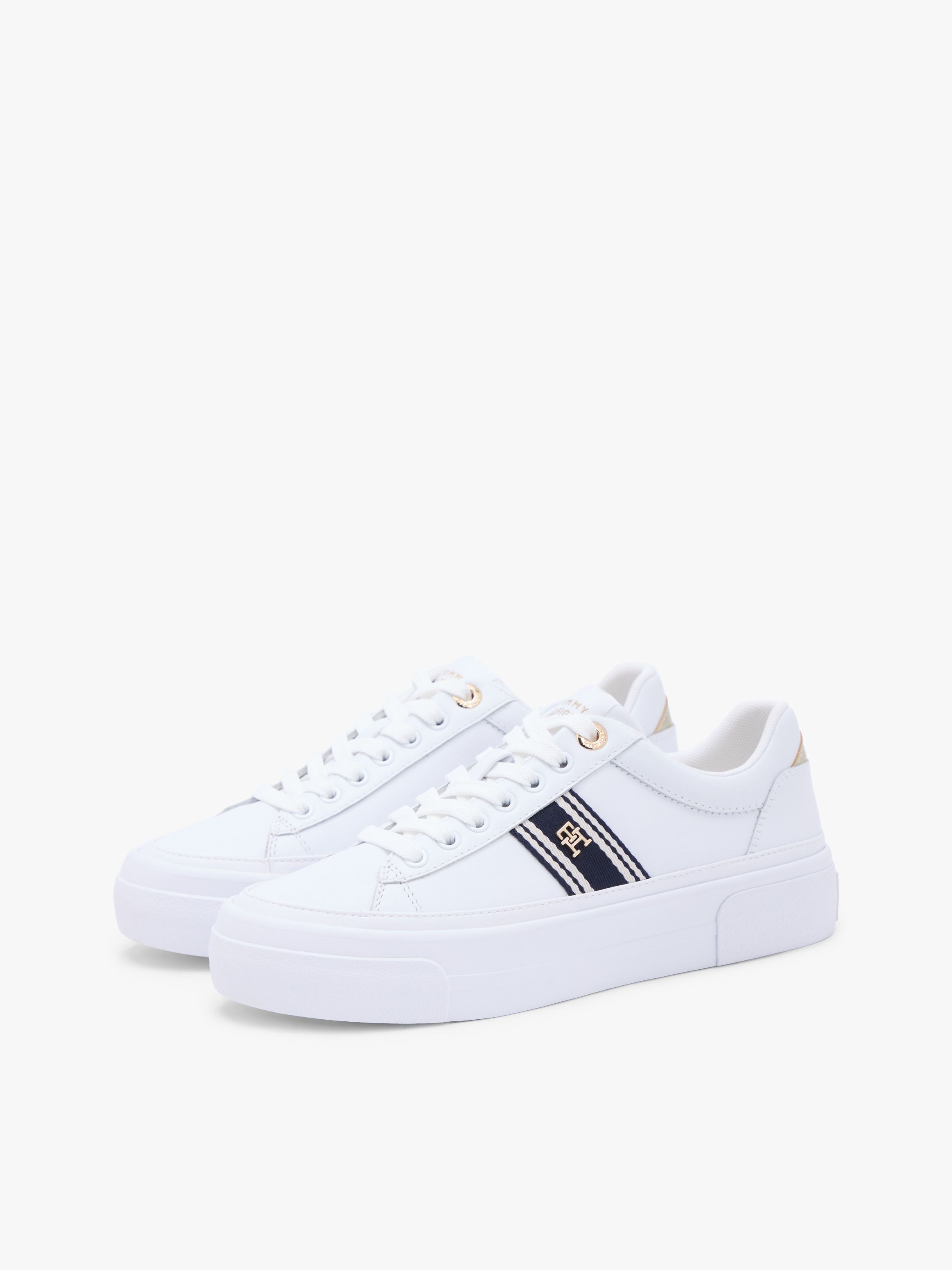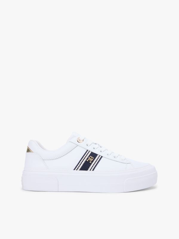 تقدم هذه الأحذية الرياضية الفاخرة إطلالة جريئة بفضل النعل السميك ولمسات لامعة على الجزء العلوي المصنوع من الجلد المطلي الأملس. أبرز التفاصيل جزء علوي من مزيج الجلد بطانة من البوليستر نعل داخلي قابل للإزالة من البولي يوريثان وألياف أخرى ومطاط حراري نعل خارجي من المطاط نعل سميك Platform لوح كعب معدني شريط منسوج على الجانب حلقة علوية متباينة تحمل العلامة لوحة حروف TH على الجانب شعار تومي هيلفيغر بارز على النعل الأوسط علامة تومي هيلفيغر القصة والمقاس منخفضة الرقبة إغلاق بأربطة مقدمة مستديرة الخامة والعناية 90% جلد، 10% بولي يوريثان